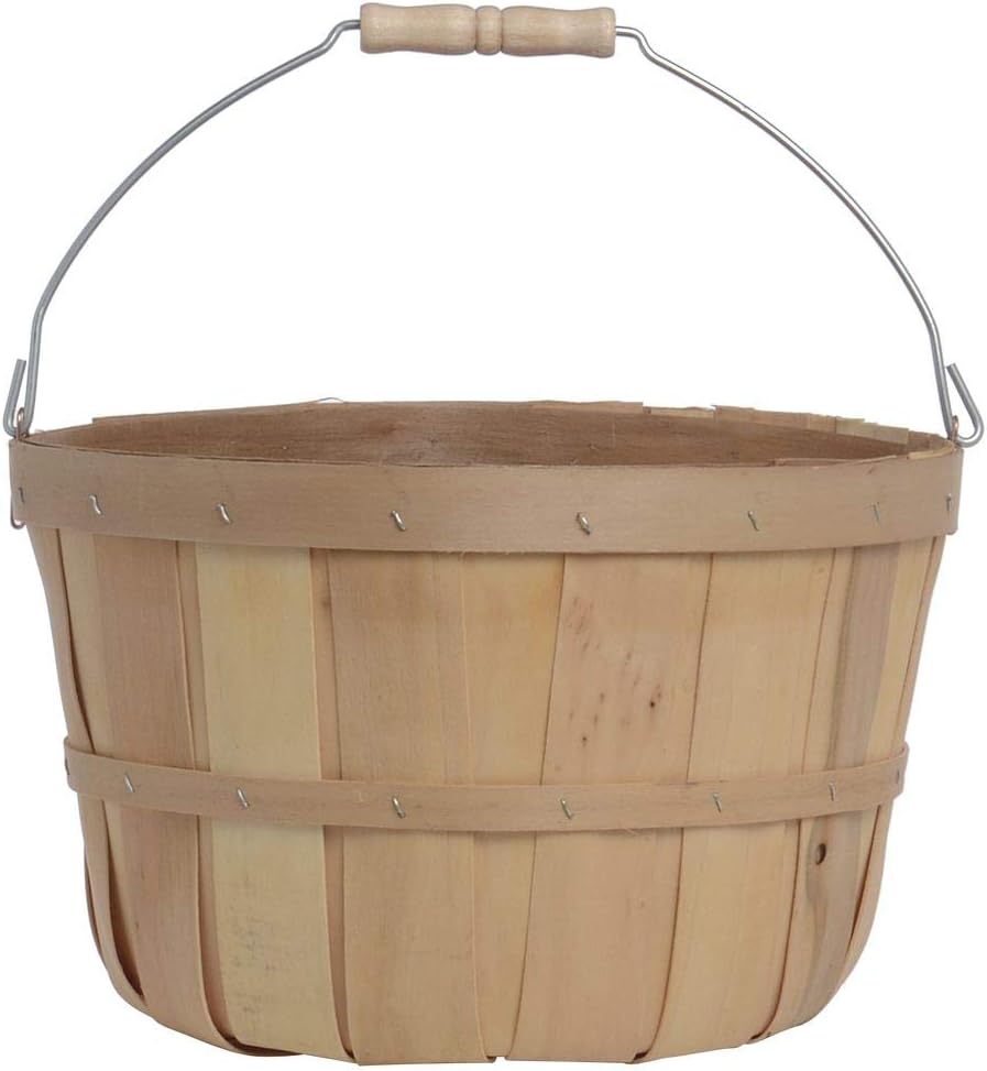 This produce basket is designed to allow air to circulate through its slats. The container can be nested for storage. The produce basket is 1 peck sized. The container has a bail handle. The produce basket is 11 x 12 inches (Dia x H).