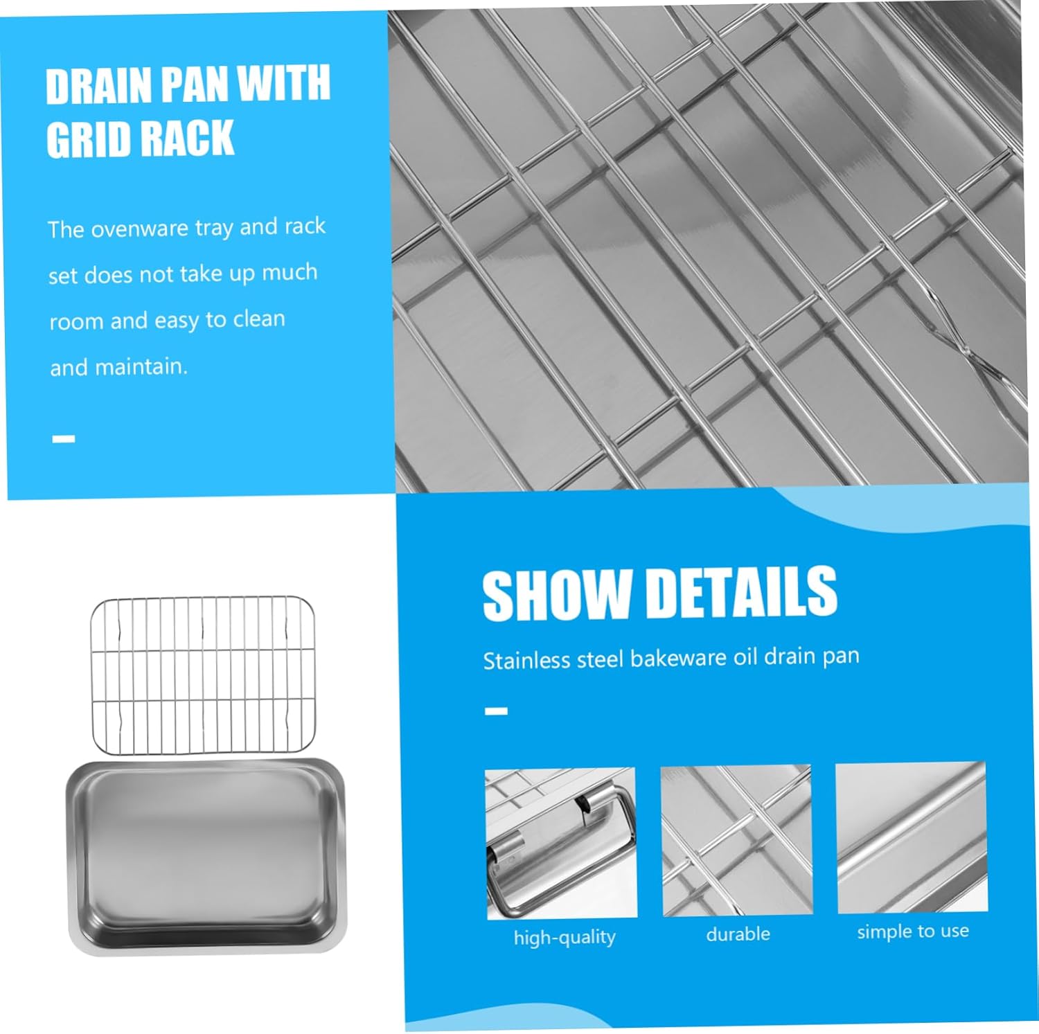 Package List 1 x set of baking tray Features - Material: Stainless steel barbecue baking tray. - Size: About 36.00X26.00X6.00cm/14.15X10.22X2.36inch grilling pan. - This baking tray is easy to operate, spend less time and have more fun deep roasting pan. - The ovenware tray and rack set does not take up much room and easy to clean and maintain roaster pan. - This tray is made of sturdy, and healthy material, which is very and to use nonstick cooling rack. - It can also store lots of items, like desserts, snacks, fruits, cupcake, jewelry or other small items frying rack tray. - Applicable to a variety of scenes, such as a party present or a personal collection steel grill roasting pan.Goods Informationsmall toaster oven pans This set of baking tray with rack has been designed for material, odorless and .toaster oven pan and premium texture, great hand feeling.small roasting pan Great for making cake, you can also use it to display snacks, jewelry, desserts at party