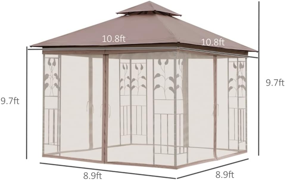 - RECTANGLE GAZEBO TENT: This patio gazebo's elegant and stylish leaf pattern posts create the space for your outdoor adventures and relaxation. This outdoor gazebo 10x10 gives you shade and peace, whether on decks, patios, gardens, or parks.- 2-TIER VENTED CANOPY: This deck gazebo's polyester canopy helps fight against water and UV rays while protecting from light rain or sunny days. No need to worry about stale air, though: the vented roof provides fresh air, while eight drainage holes prevent water pooling on the top.- MESH CURTAIN SIDEWALLS: This outdoor canopy gazebo's fully enclosed mesh screen keeps annoying elements out while adding privacy to your outdoor living.- STEEL SUPPORTING FRAME: The patio canopy's powder-coated, rust-fighting steel frame is solid and sturdy, providing plenty of relaxing seasons. Please Note: It is a light-duty tent, so please do not leave it out in windy or adverse weather conditions.- DECK CANOPY INFORMATION: - Overall Dimension: 9.8'L x 9.8'W x 9.2'H, Eaves Height: 6.5' H- for family gatherings, birthday parties, picnics, camping, and more- Assembly is required*Note: This item requires a minimum of 2 to set up. Please ensure that the item is set up correctly and anchored tightly for maximum efficiency. It is a light-duty tent, so please do not leave it out in windy or adverse weather conditions.Specification:- Color: Brown- Material: Polyester, Steel, Mesh- Overall Dimensions: 9.8'L x 9.8'W x 9.2'H- Inner Dimensions (between columns): 6' L x 6' W- Eaves Height: 6.5' H- Net Weight: 61.6 lbs.- Item Label: - 1 x Gazebo- 8 x Ground stake- 1 x ManualNote:Due to different monitors and lighting effects, the actual colour of the product may differ slightly from the colour shown in the pictures. Thank you!Please allow 1-2 cm deviation due to manual mea