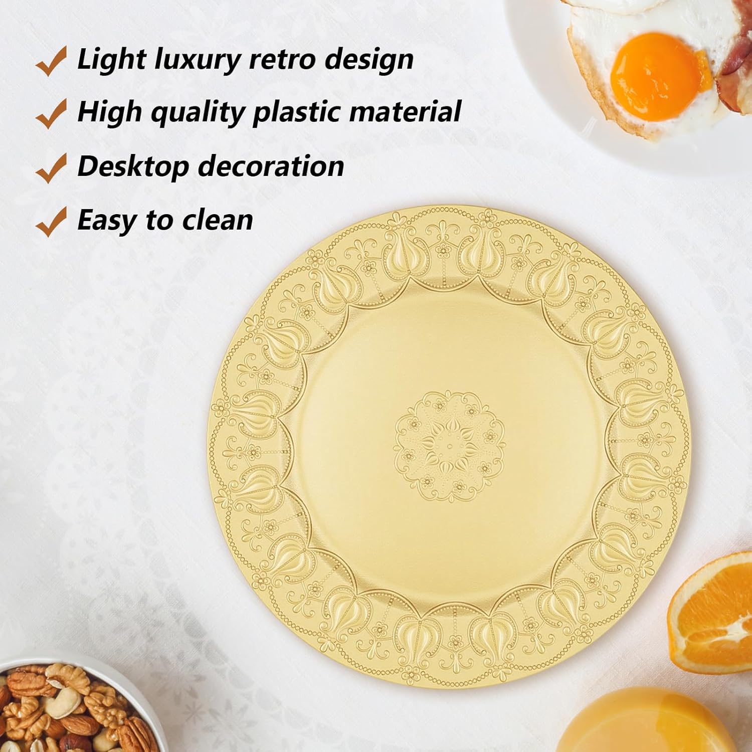 Why Choose Our 100-Pack Gold Charger Plates?This bulk set offers exceptional value with 100 reusable plastic charger plates, perfect for elevating any dining occasion from casual gatherings to formal events. The frosted gold finish provides versatile elegance across various table settings.Key Features:Great Value: 100-piece set accommodates small to regular plates (13" diameter) for appetizers, salads, desserts, and cakesProper Size: 13" diameter x 0.8" height design optimizes space with stackable storage when not in useReliable Material: Durable plastic construction offers lightweight sturdiness (washable/reusable) unlike fragile ceramic or disposable paper optionsWhy It's Essential:Frosted gold floral design enhances table settings for brunches, weddings, holidays, and special occasionsTextured surface prevents plate slippage while maintaining sophisticated appearanceGlossy finish creates attractive food presentation at home/hospitality venuesColor variations occur under different lighting conditions (as shown in product images)Ideal for event planners and home entertainers, these charger plates combine practical functionality with decorative appeal. The neutral gold tone seamlessly coordinates with existing dinnerware while adding instant glamour to any tablescape.