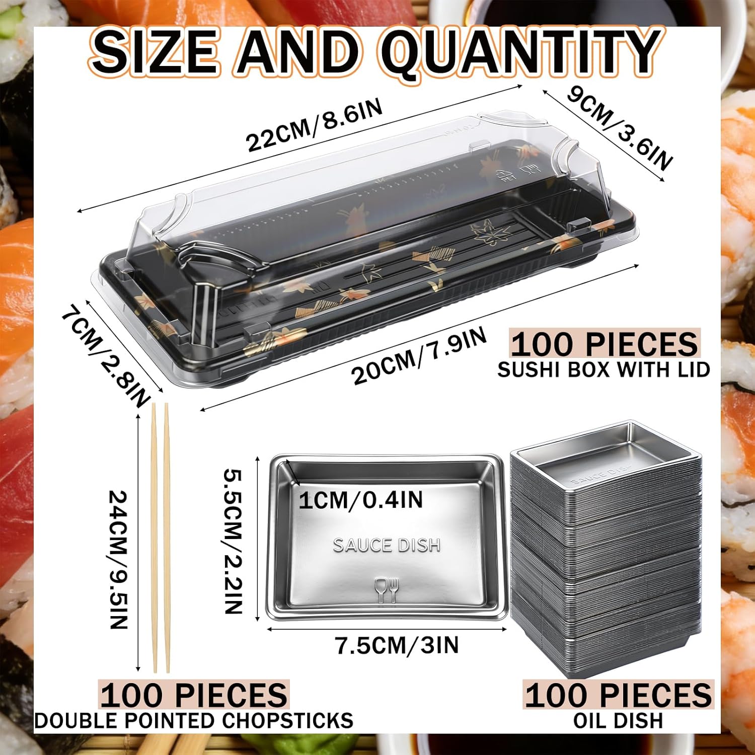 Features: Comprehensive Value Set: Crafted to meet diverse dining needs, this 300-piece disposable sushi tableware set includes sushi boxes, sturdy lids, authentic bamboo chopsticks, and sauce dishes. Ideal for storing and serving sushi rolls, snacks, or baked goods, it caters seamlessly to both home use and professional settings like restaurants or takeout services. Durable: Made from robust materials, this sushi box set ensures durability and freshness. The anti-fog, leak-proof lids provide clear visibility and secure sealing, ideal for hot, cold, or wet foods. With stackable, space-saving boxes, it's nice for both kitchens and busy sushi restaurants, maximizing efficiency and presentation. Specifications: Material: food-grade plastic Color: transparent Size: Sushi box: 7.9 × 2.8 inches / 20 × 7 cm Sushi box lid: 8.6 × 3.6 inches / 21.8 × 9.1 cm Sauce dish: 3 × 2.2 inches / 7.5 × 5.5 cm Chopsticks: 9.5 inches / 24.1 cm length Package includes: 100 × Sushi boxes with lids 100 Pairs Japanese bamboo chopsticks 100 × Sauce dishes Notes: Manual measurement, please allow slight errors on size. The color may exist a slight difference due to different screen displays This product is for single use only and is not suitable for dishwashers or microwaves