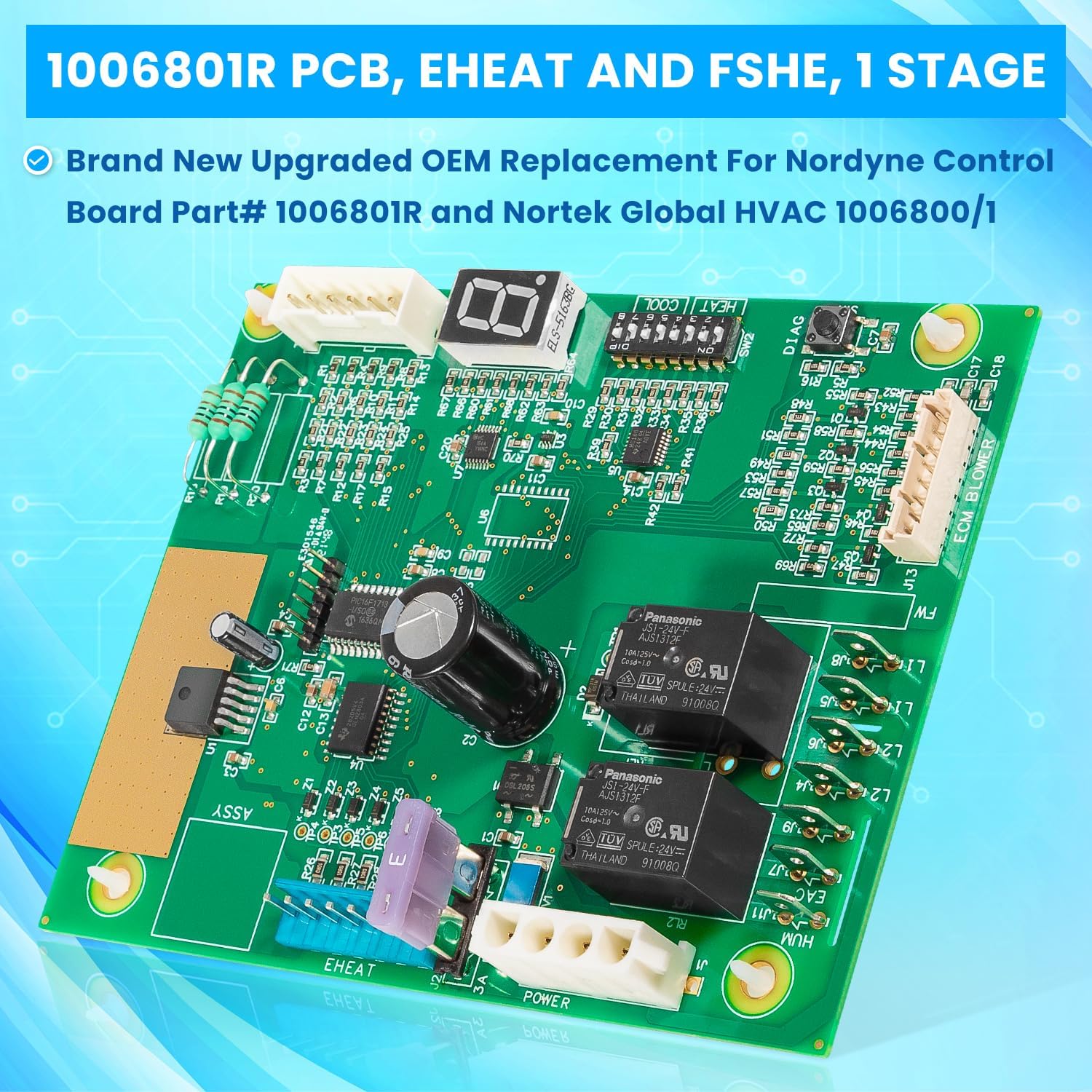 Great Compatibility — Compatible with Nordyne, Intertherm, Revolv, Miller, Gibson, Frigidaire, Westinghouse, Philco, Tappan and other brand Nordyne furnaces with EHEAT, FSHE, Single Stage. Brand new upgraded OEM replacement for Nordyne control board part# 1006801R and Nortek Global HVAC control board part# 1006800/1.