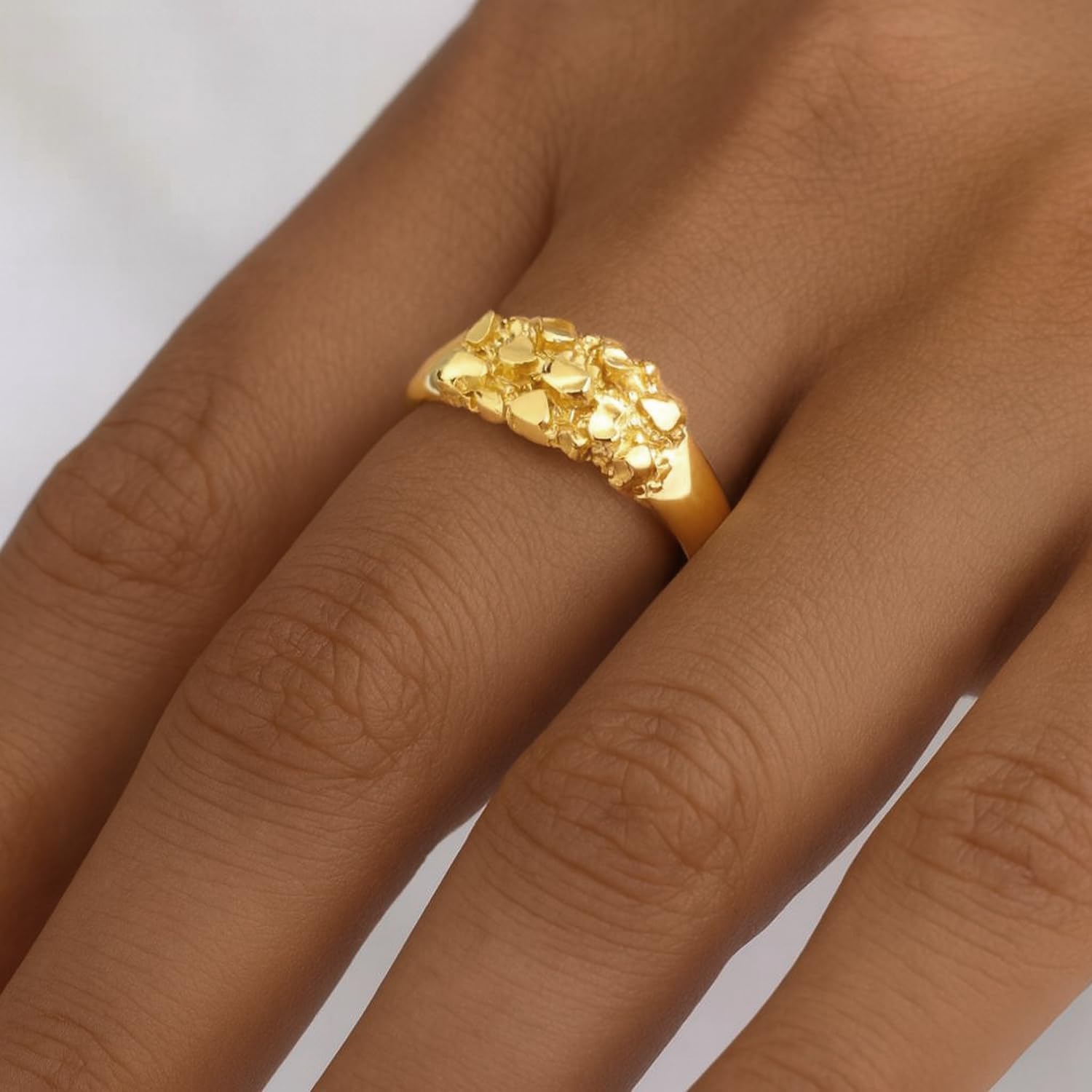 10k Yellow Gold Ring It is For Women Head Size(Nugget Portion) : 13 mm x 7 mm (0.5 in x 0.27 in) Ring Size 6 Total Ring Weight : 1.4 g