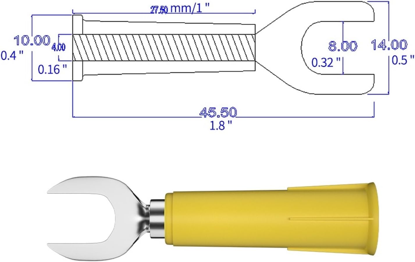 Speaker Wire ConnectorsSpecification:Item Type: Banana U Fork Spade Material: Copper/PVCRated Voltage and Current: 30V, Maximum 36A