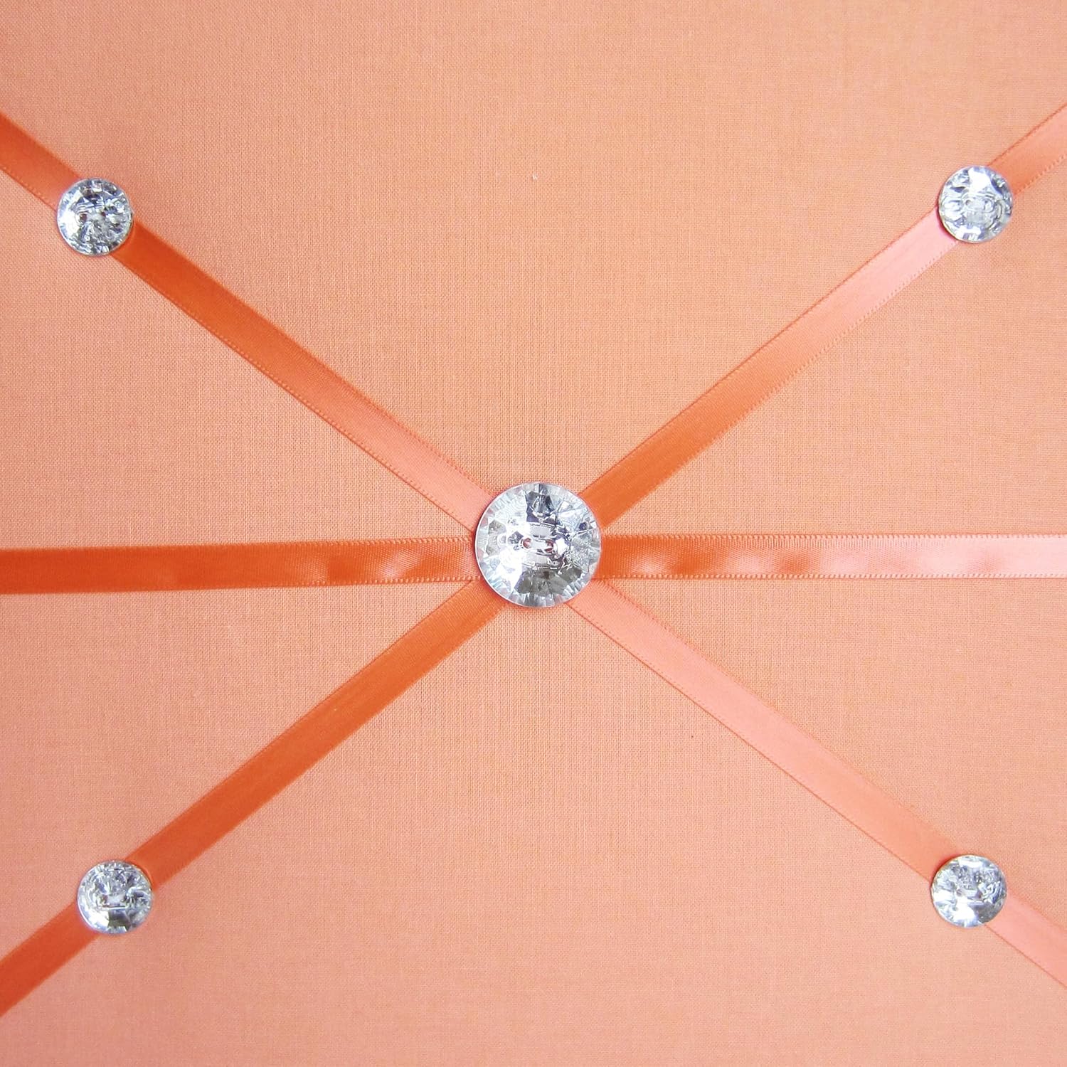 This 11"x14" memory board is so pretty in a solid peach fabric. The fabric is accented with a matching satin ribbon and crystal buttons. Handmade fabric memory boards are designed to be used without tacks or push pins. Great for: *Organizing photographs (your own or all those Christmas photo cards!) *Organizing business cards *Hanging hair accessories or jewelry *Safely storing your household bills *Organizing the million slips of paper covering your desk! This memory board is made with designer fabrics and top quality materials. The back is finished with a felt back and ribbon. Each memory board has a saw tooth hanger on the vertical and horizontal sides. Due to the many variations in monitors and browsers, color samples may appear different on different monitors. Computer monitors are not all calibrated equally and color reproduction on the Internet is not precise. Since it is not possible to guarantee our online colors will look the same on all computers, we do not guarantee that what you see accurately portrays the color of the actual product