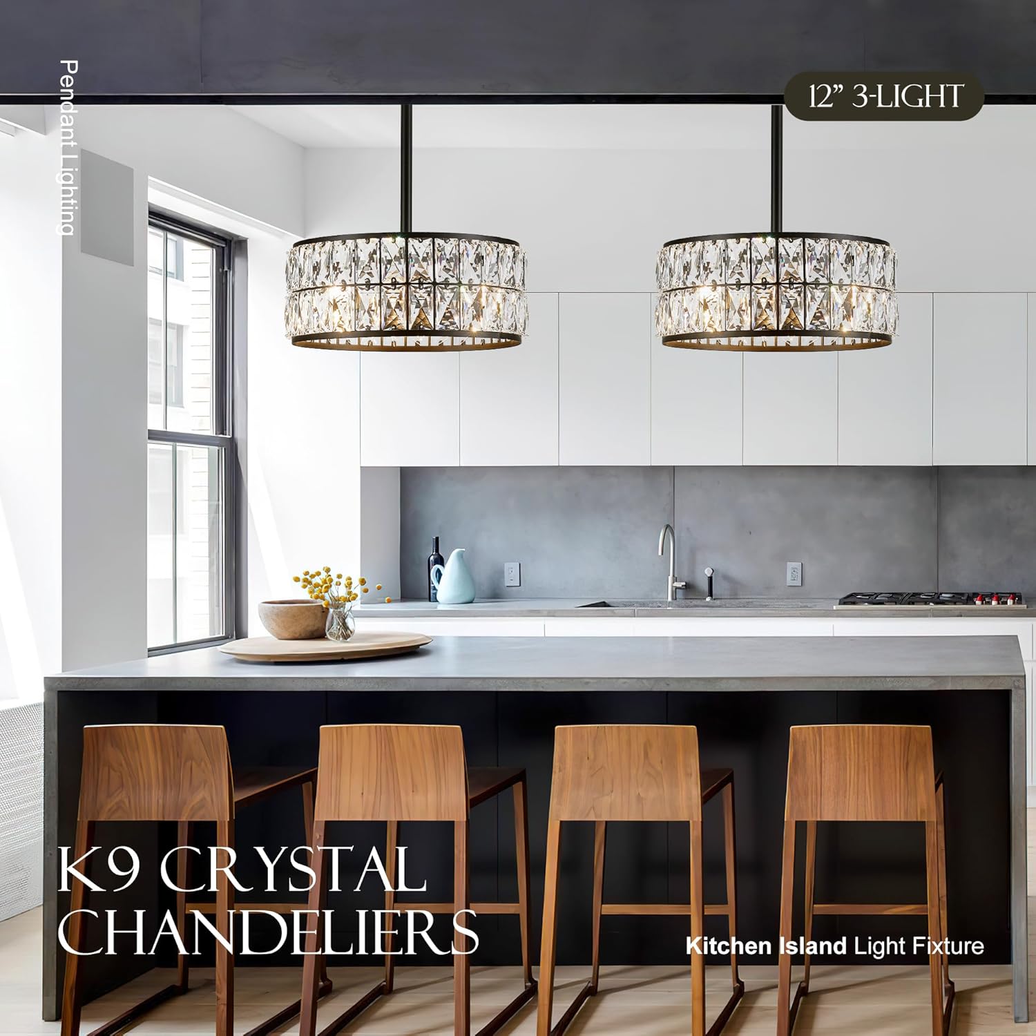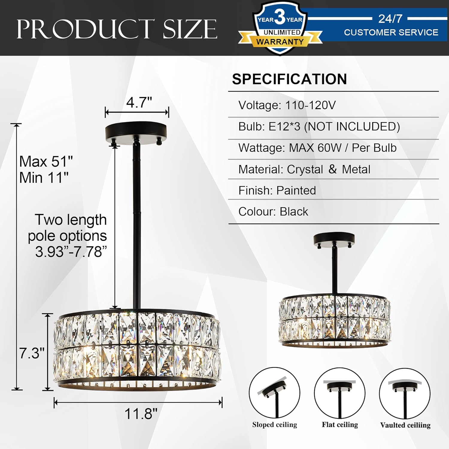 Who we are:Salaiwei is a professional indoor lighting fixtures manufacturer. To produce a wide variety of high-quality products, we have advanced facilities and a professional designer team.Main products:Modern Pendant Lights, Wall Lights, Ceiling Lights, Chandeliers, and Island Lights, etc.Product Specification:Style: Modern Crystal Chandeliers Material: Metal + CrystaDimension: 11.8"L x 11,8"W x 51"HBulb Base: 3*E12 Base (Bulb not included)Voltage: 110VMaximum Wattage: 60WSuggested room fit: foyer, hallway, stairway and entryway, living room and more.Package Included:1x Crystal Chandeliers 1x User manual1x Accessories packageWarm Tips:Please make sure you have cut off the electricity supply before installation.Do not exceed specified wattage.Avoid using harsh chemicals and abrasives as they may damage the finish.If you have any problem with installation, please feel free to contact us, we will reply