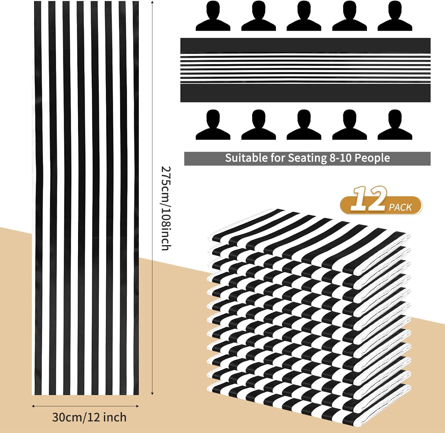 Product DescriptionFeature:Made of premium quality polyester fabric, durable and reusable, will last for many years to come,Its waterproof, oil proof and stain resistant attributes make clean up a breeze; This black and white Striped table runner adds a different dining experience while meeting the multipurpose demands of everyday use.They are crafted carefully, Classic stripes, simple and stylish, never outdated.Black and white striped table runners can be used for indoor and outdoor activities. whether it's a wedding, banquet, buffet, anniversary, or birthday party,the classic black and white striped table decor transforms many events into memorable experiencesSpecification:Material: PolyesterColor:Black & WhiteDimensions: 12 x 108 inches/30 x 275 cmPackage includes:12 Pack Black and White Striped Table RunnerOur Service:24hours online customer serviceIf You're not completely satisfied with your purchase simply let us knowWe will help you solve your problem well.Notes:Manual measurement, please allow slight size error.Colors may vary slightly due to different screen displays.
