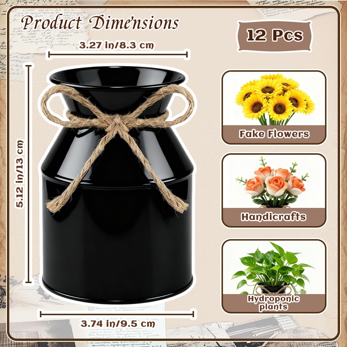 Name: 12 PCS 5.12in Rustic Vases Metal Galvanized Milk Can with Bow Vintage Flower Bucket Suitable for Centerpiece Anniversary Wedding Birthday Party Floral Arrangement Material: Metal Quantity: 12pcs Color: As shown in the pictureApplication: These milk can vases are ideal as table centerpieces for weddings, birthday parties, or holiday gatherings, adding a touch of rustic elegance to any event. They can be used for floral arrangements, tableware storage, or as standalone rustic-style decor. Their versatile design supports DIY creativity and seamlessly integrates with various interior styles.Packaging ContentsRustic vase × 12 piecesAttentionGoods due to long time transportation, there may be individual product defects, if you encounter defective products, please contact us in time for replacementAs the above dimensions are measured manually, the size of the actual item you receive may be slightly different from the above dimensionsDue to monitor, camera or other factors, there may be a slight color difference