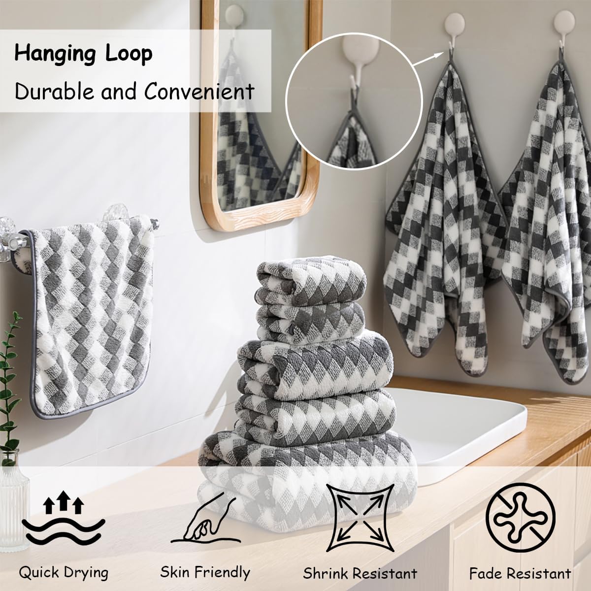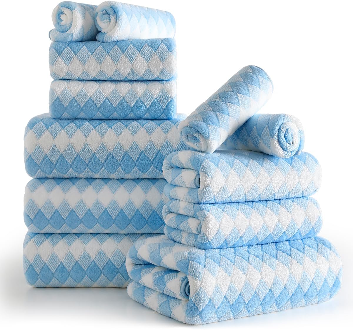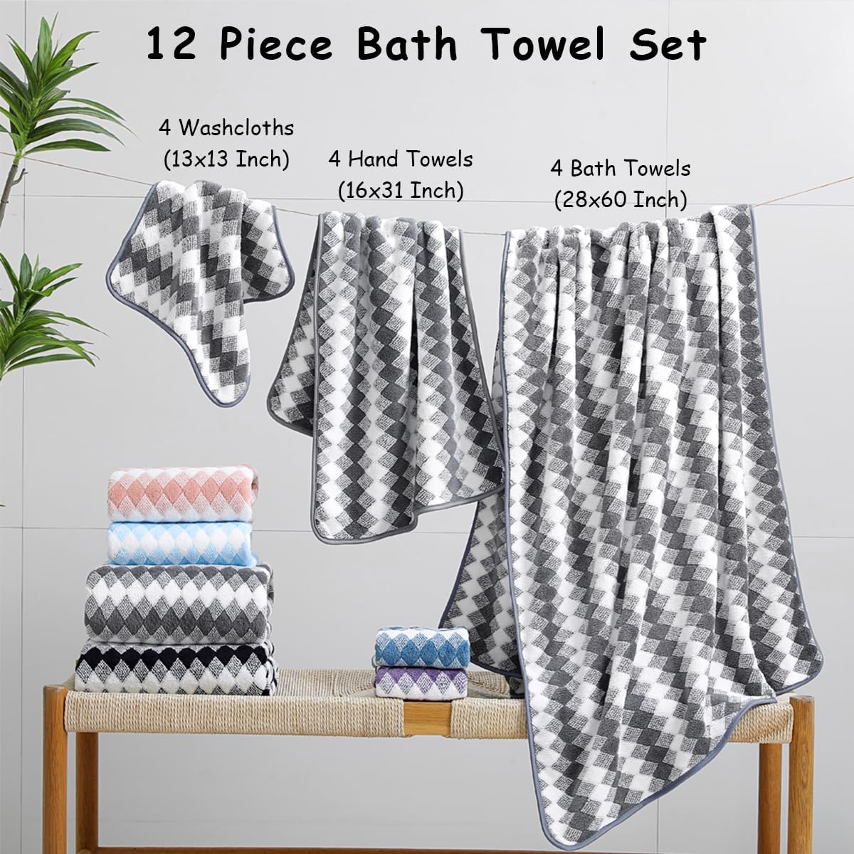12 Piece Diamond Family Towel Set Package Includes:4 pcs 27“x60” bath towels4 pcs 15“x31” hand towels4 pcs 13“x13” washclothsA family towel set offers versatile useAbsorbent,quick-drying bath sheets suitable for bathrooms,beach chairs,sofas,spas,pools, gyms, and hotels