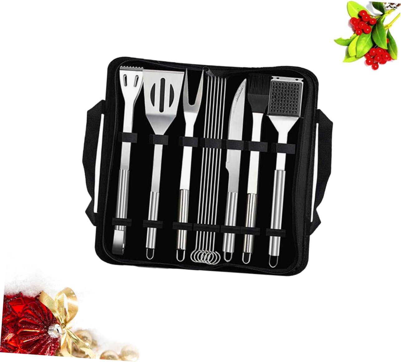Package List 1 x Spade 2 x Brush 1 x Fork 1 x Knife 1 x Clamp 6 x Grill Skewers 1 x Storage Bag Features - Color: Black stainless steel BBQ utensil - Size: About 40x16.5x6cm barbeque accessories with storage bag - Material: Stainless steel, silicone and cloth - Includes spade, clamp, knife, fork, brush, steel brush and skewer barbecue tools kit - A great foodies, barbecue fans, cooks, camping lovers BBQ tools . - Handy BBQ tool to make your barbecue more convenient and accessories for BBQ. - Put these tools into a bag, you can easily store this BBQ set and each tool is neatly organized, carry outdoor and put into the car. - Enjoy a happy and easy barbecue time and delicious food with this tool kit.Goods Descriptiongrill accessories for BBQ This set tools is well made of stainless steel material for and use.stainless steel BBQ utensil With a handle storage bag, can carry them easily.barbeque accessories with storage bag enjoy a happy and easy barbecue time with your friend or family etc.barbecue tools kit suitable for outdoor barbecue or home use