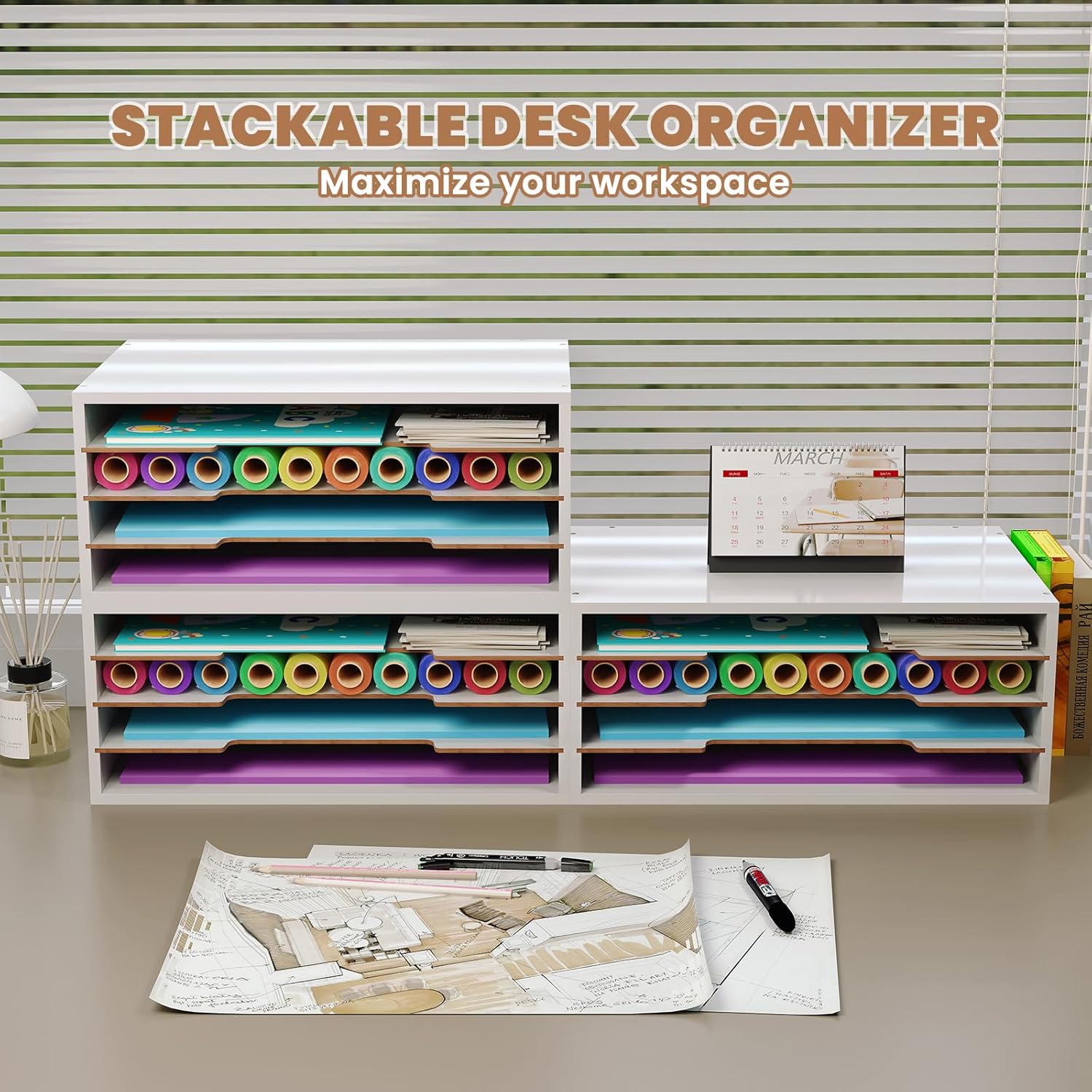 Features: Large Capacity Storage: Our 4-tier wood paper organizer measures 20.3"W × 13.7"D × 8.7"H , with each tier measuring 19.8"W × 13.5"D × 1.8"H. This desk paper organizer provides ample space for storing various supplies in 11"x17"/12"x18"/13"x19" sizes, like construction paper, craft paper, scrapbook paper, vinyl, dtf transfer, file folders, documents, etc., keeping your workspace neat and organized.Sturdy and Stable Construction: The craft paper organizer comes with 11 trays, allowing you to freely customize the height of each layer according to the size of your items. Whether you sort your supplies by color, type, or project, this paper tray organizer makes organization effortless. Each tray is designed with grooves to ensure easy access to your items while preventing paper damage.Package Includes: 4-Tier 13 x 19 Paper Storage Organizer 1 Pack Specifications: Material: WoodColor: WhiteSize: 20.3"W × 13.7"D × 8.7"H