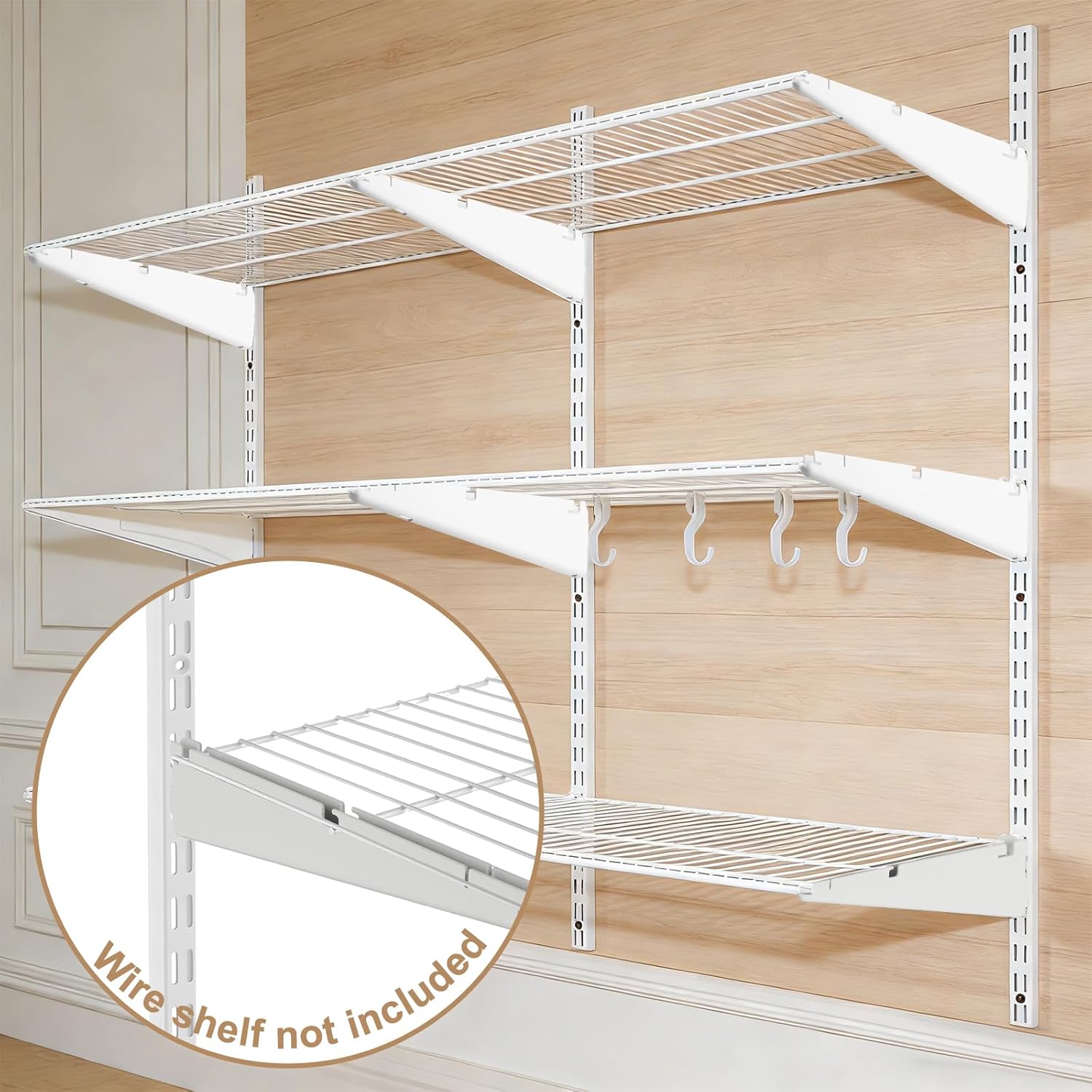 These 13-inch double-track wire shelf brackets are designed for use with standard twin-track wall shelving systems. Made from strong steel with a white finish, they offer reliable support for both wire shelving systems and wood shelves. Suitable for closets, pantries, laundry rooms, offices, and garages, they allow flexible shelf positioning and easy reconfiguration. Installation is simple – just slide the brackets into your existing double-track uprights and place the shelf on top. This 10-pack provides excellent value for larger projects or multi-shelf setups.