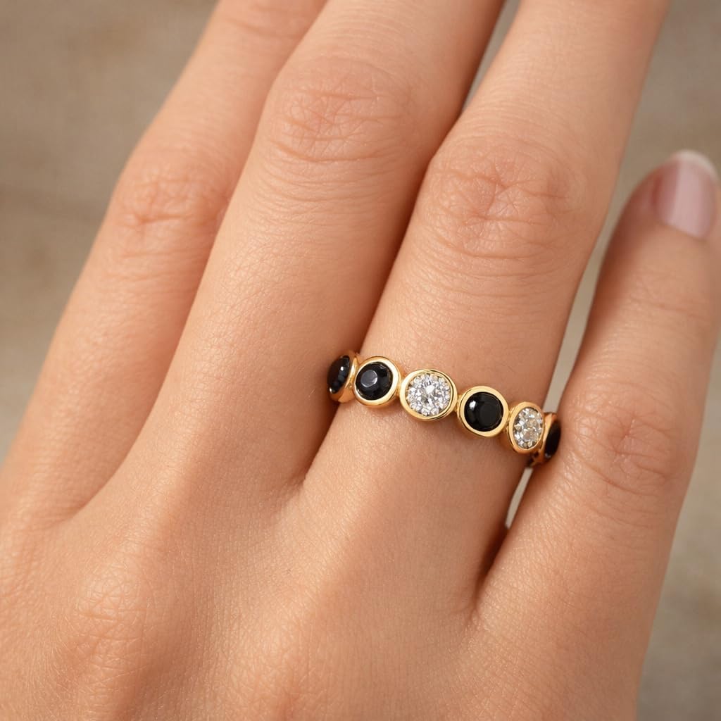 This stunning black onyx and cubic zirconia eternity band ring is designed for women who love bold elegance with a modern touch. Featuring alternating round black onyx stones and brilliant CZ, each securely bezel set, this ring offers a refined balance of contrast and sparkle. Crafted with a 14K yellow gold plated finish, the ring delivers a luxurious glow while remaining comfortable for daily wear. Its smooth eternity band design makes it perfect as a wedding band, promise ring, anniversary ring, or stackable fashion piece. Whether worn alone or paired with other rings, this timeless design adds sophistication and confidence to any jewelry collection.