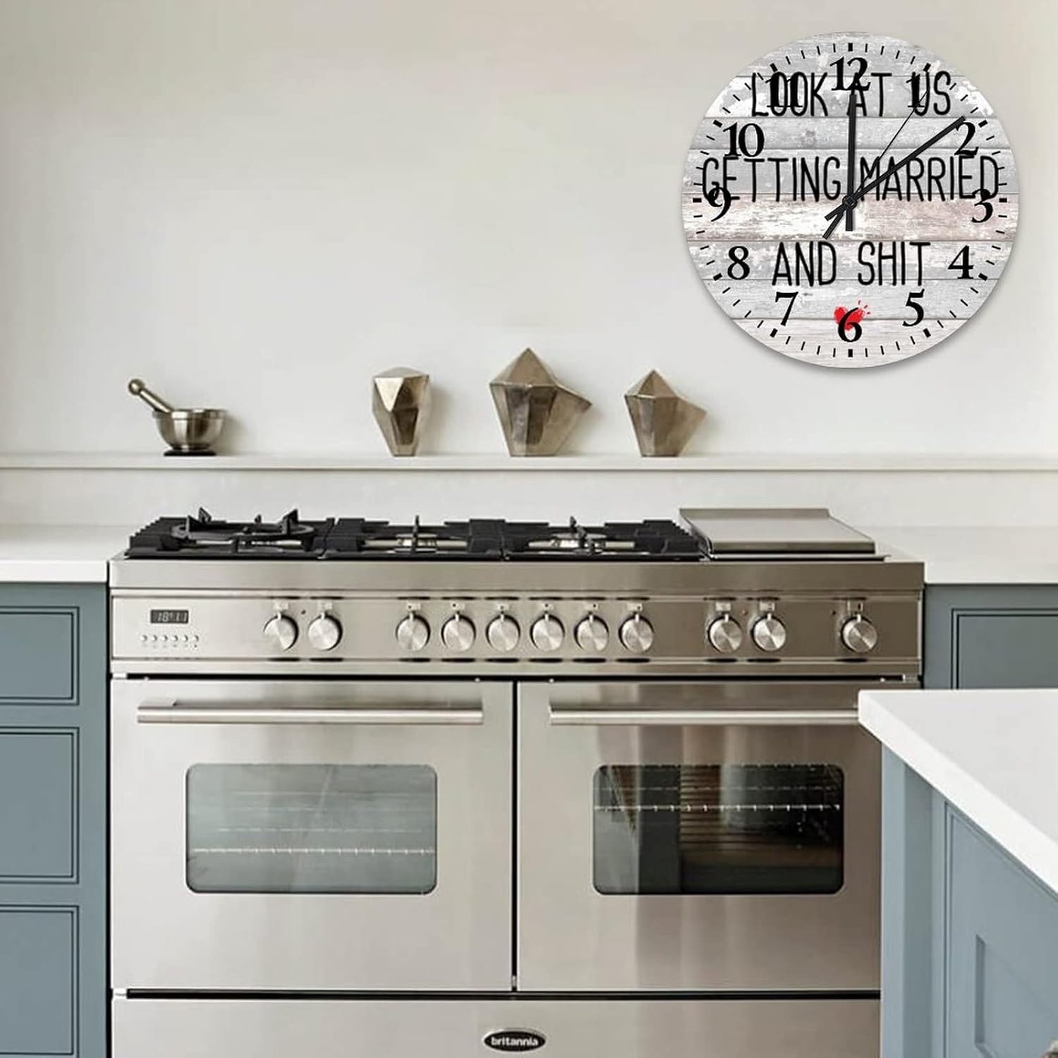 Look at Us Getting Married And Shit wall clock Best Gifts for Valentine's Day modern clock Battery Operated Arabic Numbers Clock Home Living Room Office Decoration 15 Inch??Details:Product Size: 10/12/15 inches, (25/30/38 cm)Shape:RoundMaterial: Wood??Functional Home DécorThis Romantic Quote for Valentines Day clock aren't just for timekeeping. They function as beautiful wall decor pieces, beyond telling time, and bring both style and purpose to any room.A charming home decoration, very suitable as a housewarming gift, making the home more warm. Suitable for any room, you can put it in any room such as home, living room, master bedroom, kitchen, bathroom, home office. Elegant, durable and stylish.??Clock Hands Troubleshooting Guide:Check that the battery is a new battery and not a used battery.Make sure the hour and minute hands are not crossing or touching each other. If they are, adjust the hands by slightly bending them.See if the center pin that holds the hands together is firmly pushed in or screwed on, depending on the style.If hands are still not moving after the above, please reference the hands replacement instructions included with all of our open face clocks.