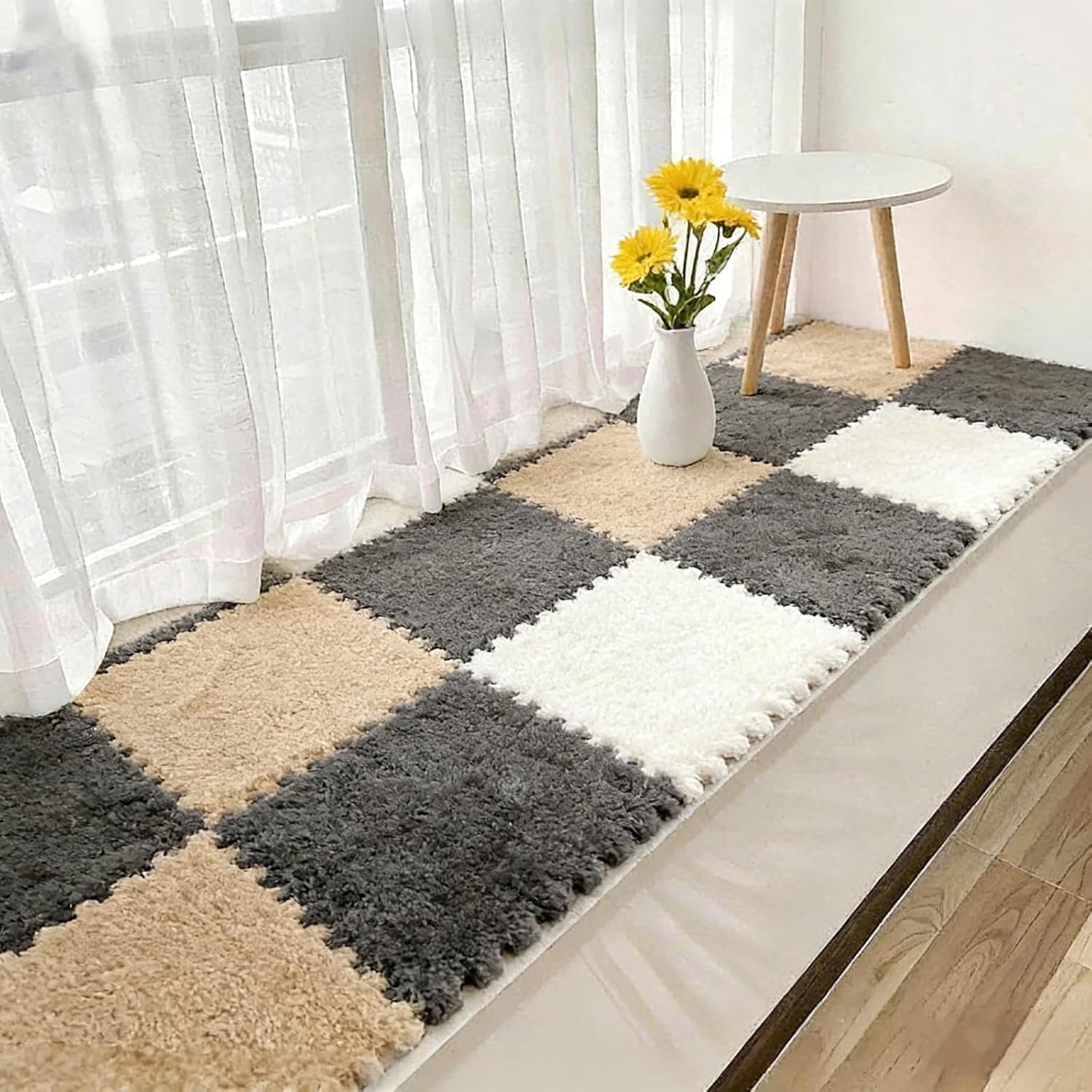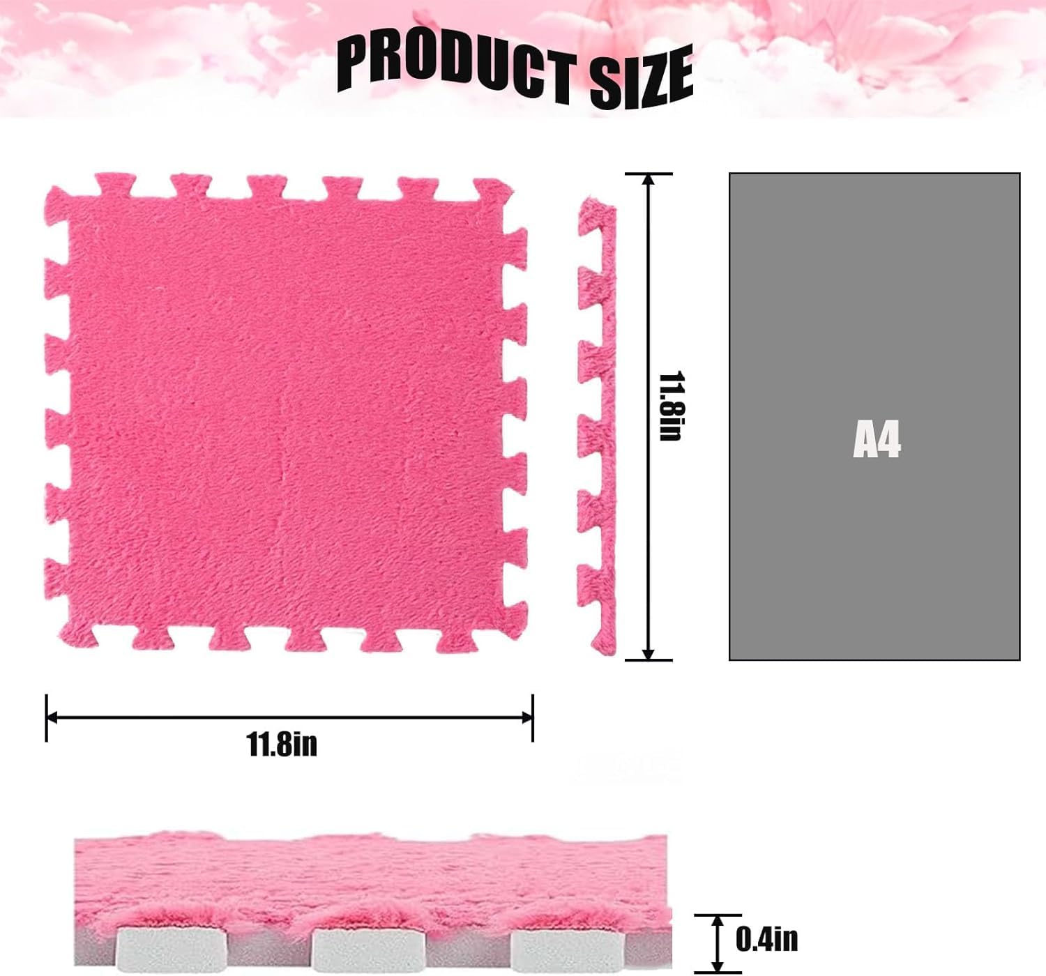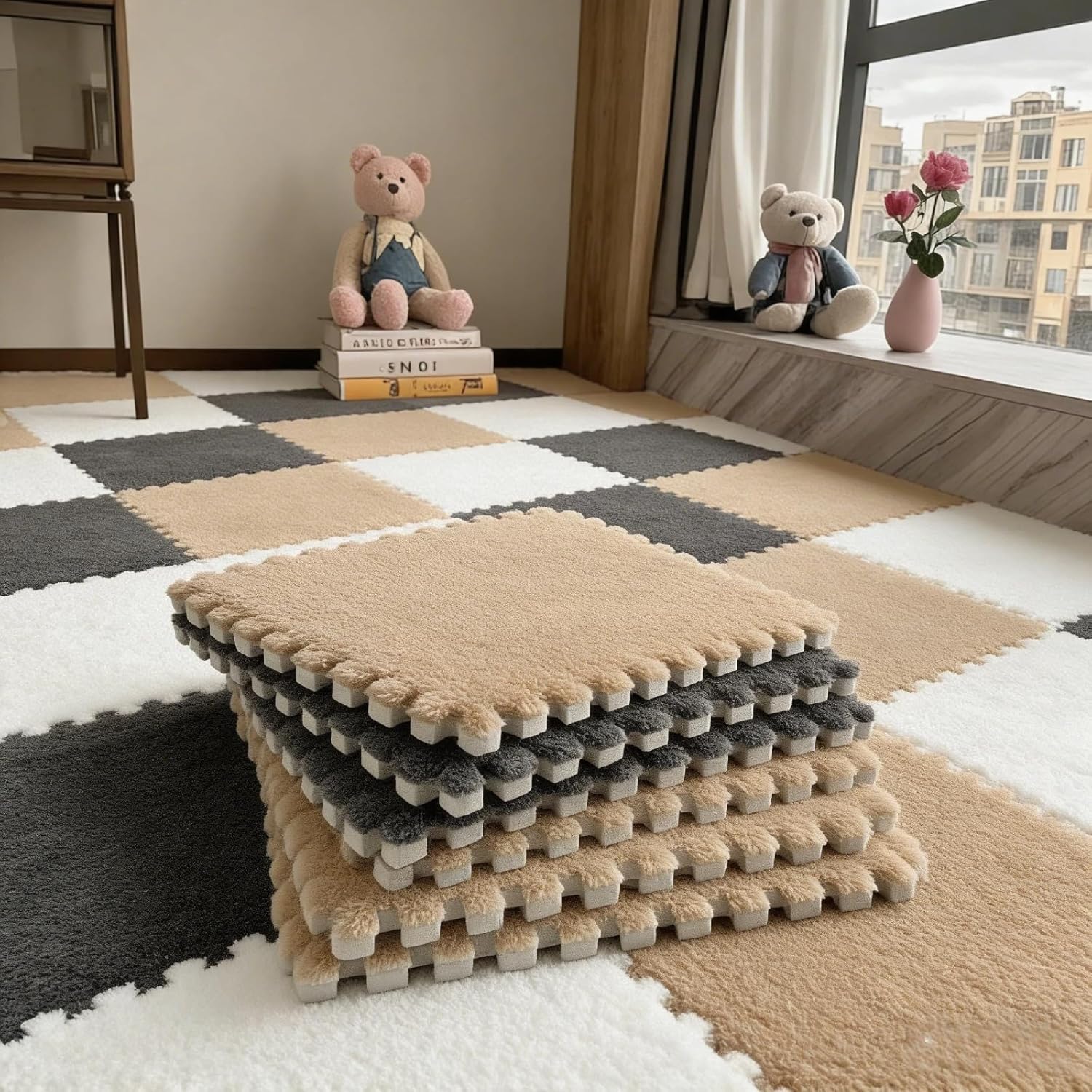Color: Light Brown&White&Grey Size: 11.8x11.8x0.4in Product Include: 16pcs plush foam floor mats Material: EVA, Cotton Features: The floor mat is made of EVA material and comfortable cotton, not easy to shed hair, comfortable and soft