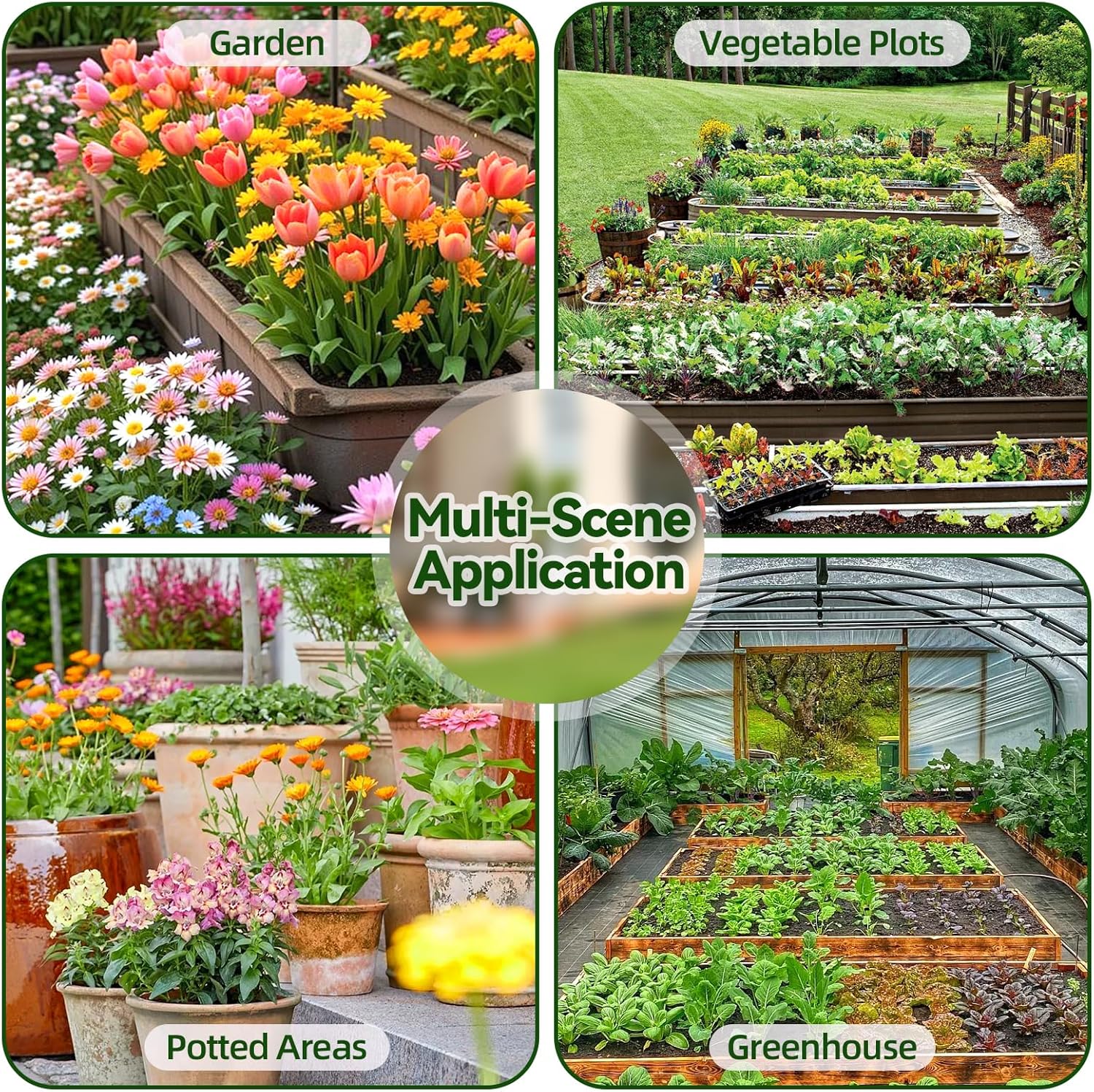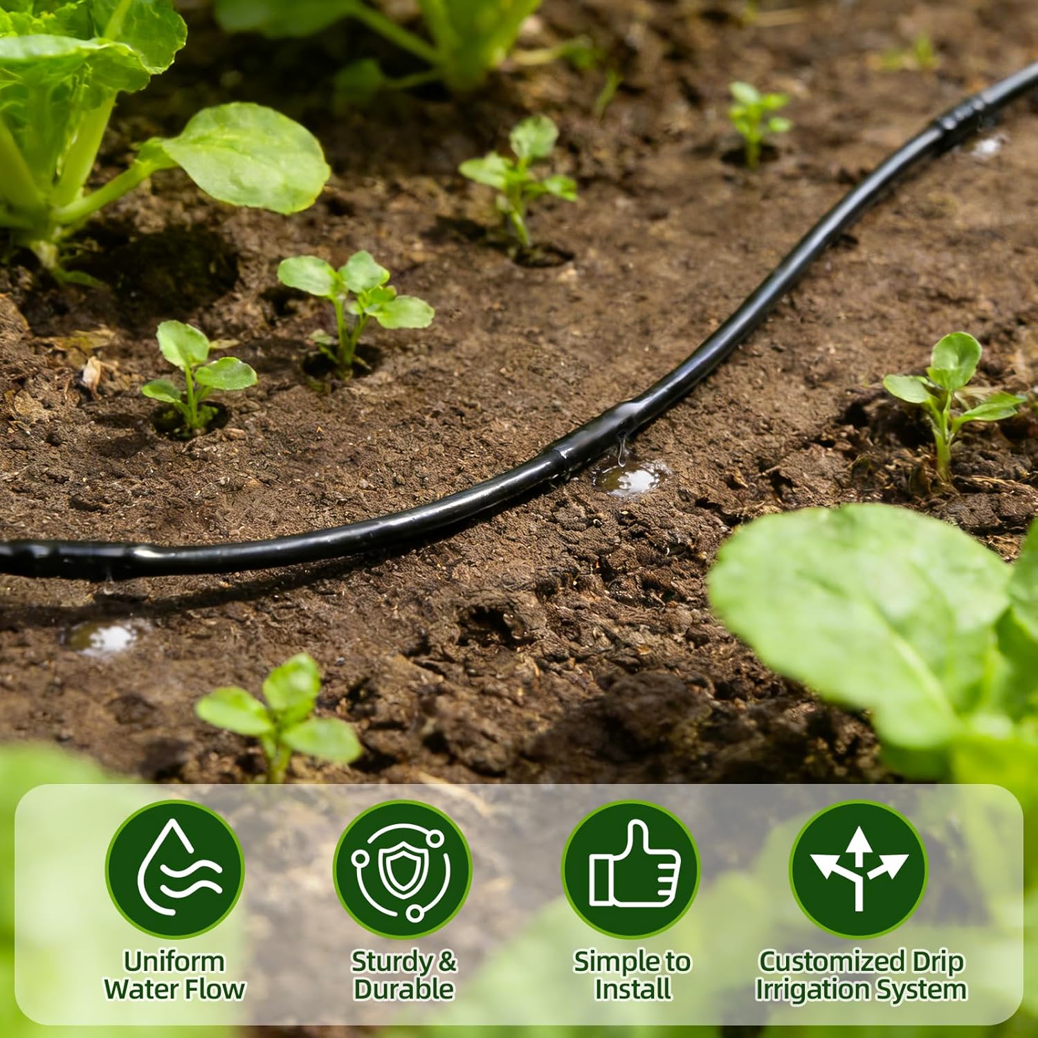 FeaturesBuilt-in Emitters: No need to buy or install separate drippers—just unroll, cut to length, and lay it out. It’s a straightforward, no-hassle way to set up or expand your irrigation system.Consistent, Even Watering: The built-in emitters in drip tubing keep water pressure and flow even along the whole line, so plants at the far end get the same amount as those up front. You can cut it to fit any bed, row, or container setup.Package Included:1 x 32FT 1/2” drip main tubing1 x 150FT 1/4” drip line tubing2 x 1/2” to 1/4” 6-way connector3 x 1/2” to 1/4” 3-way connector1 x 1/2” faucet connector1 x universal faucet connector2 x 1/2” end plugs5 x 1/4" barbed couplings5 x 1/4" 90 degree elbows3 x 1/4” barbed tee2 x 1/4” switch valve15 x 1/4" end plugs1 x teflon tapeWarm Tips:1. Please flush the water line before installation to avoid emitter clogging from debris.2. Cut the drip irrigation tubing with sharp scissors for a clean cut and ensure tight connections to prevent leaks.3. Store unused tubing in a cool, dry place away from direct sunlight; use couplings to extend the line if needed.