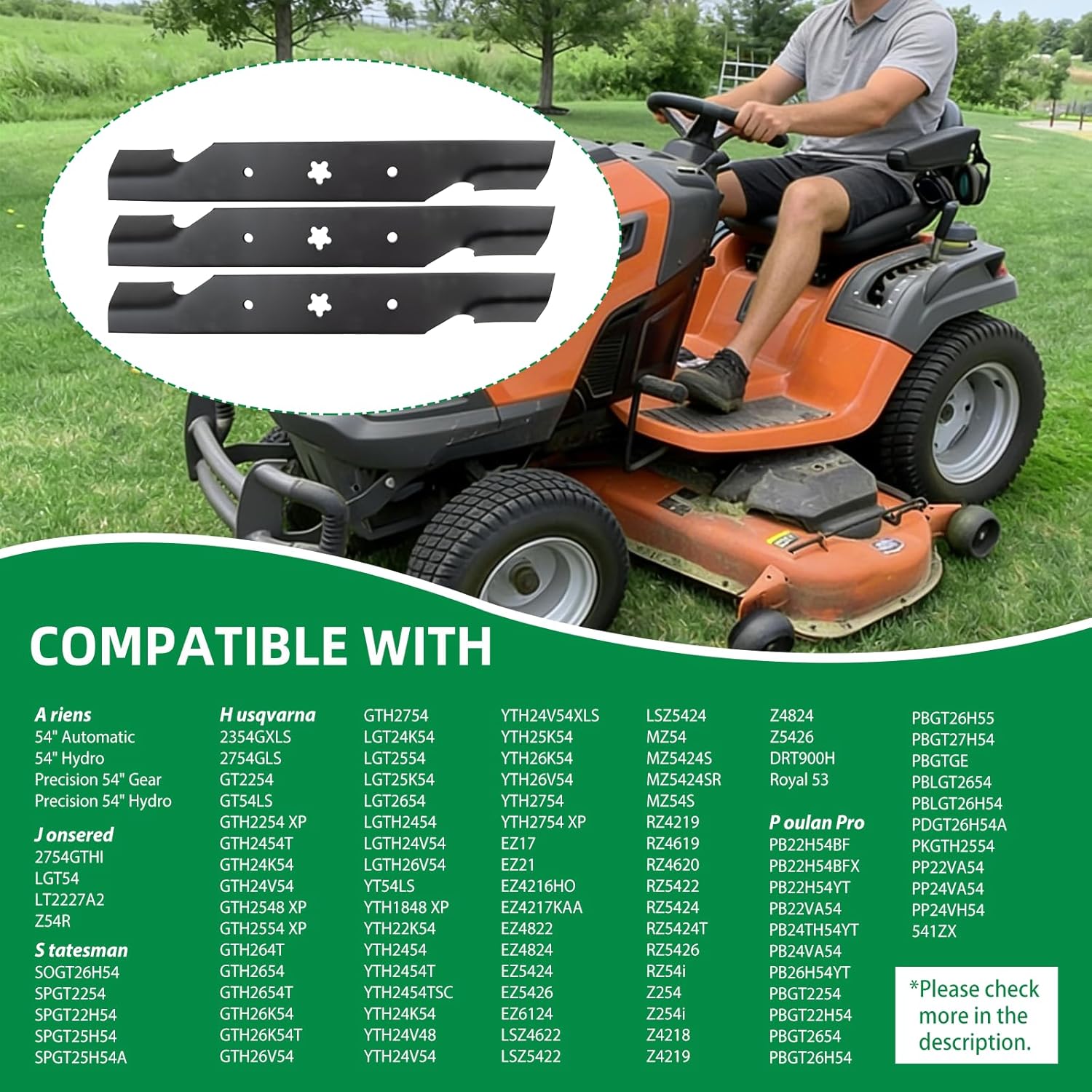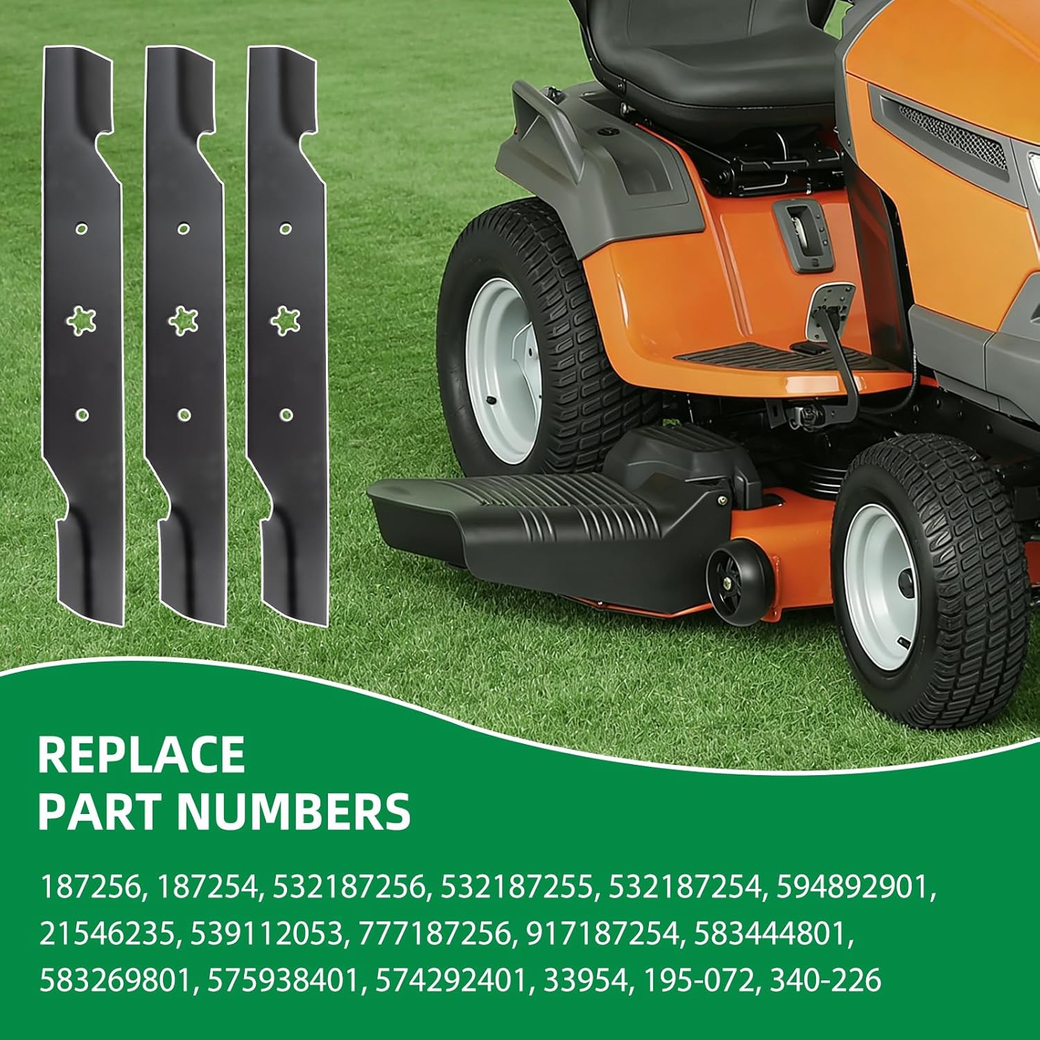 187256 lawn mower blades are engineered for perfect compatibility with 54" cut models from H usqvarna, A riens, P oulan Pro and more listed ride-on tractors and zero-turn mowers. Direct replacement for multiple OEM part numbers including 187254, 532187256 and 532187255, these blades feature a notched high lift design to enhance grass discharge efficiency, preventing clumping and clogging. Measuring 18.5" in length with a 5 point star center hole, 2.5" width and 0.1875" thickness, they deliver clean even cuts and are constructed from durable steel for long-lasting performance. The 3 pack provides extended use time, reducing frequent replacement needs, with easy bolt-on installation for quick setup.