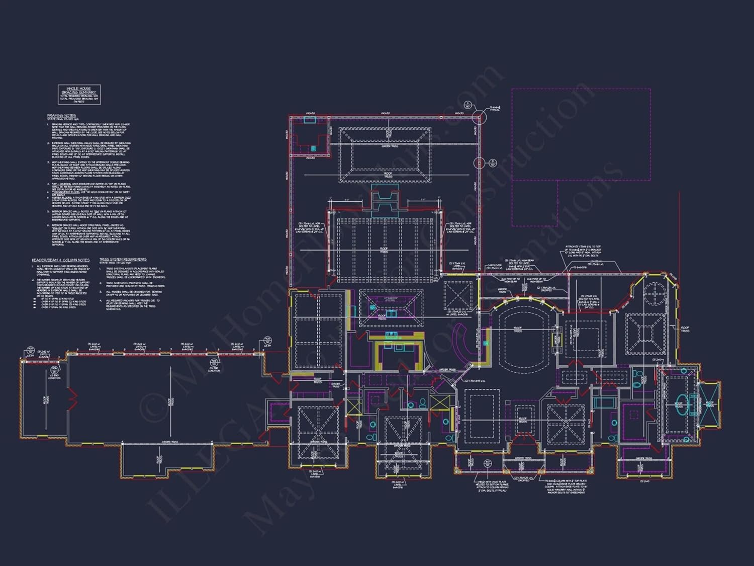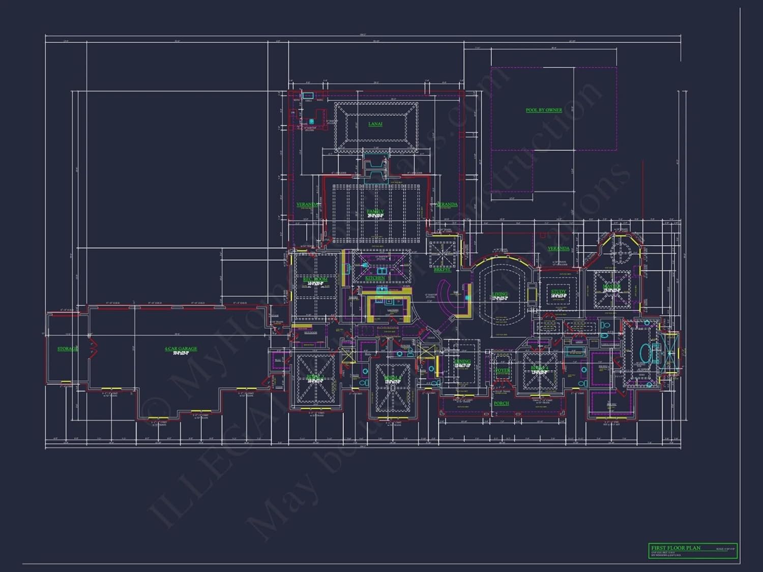 Width: 184′-2″Depth: 95′-8″Htd SF: 5,298Unhtd SF: 3,821Luxury One-Story House Plan with 5,298 Sq. Ft. and Elegant Open LayoutDiscover this 5,298 square foot luxury house plan featuring 4 bedrooms, 5+ baths, vaulted ceilings, and CAD blueprints—designed for comfort and elegance.This luxury house plan offers a stunning blend of open layout design and timeless architecture. With high ceilings and custom finishes, it's the perfect blueprint for refined living and personalized home design.Key Features of the Home PlanLiving Areas - Heated & UnheatedHeated area: 5,298 sq. ft. across a single expansive floor.Unheated extras: Lanai, covered front porch, patio, and garage.Bedrooms & Bathrooms4 spacious bedrooms including a luxurious first-floor Owner Suite with walk-in closet (WIC).5+ bathrooms including Jack and Jill setups for added convenience and privacy.Interior Highlights12-foot vaulted ceilings throughout the main living areas enhance space and light.Open floor plan flows through the great room, dining area, and kitchen. View open layouts.Bonus room offers flexibility as a gym, game room, or creative studio.Private study or home office ideal for remote work. Explore home office plans.Spacious laundry room and mudroom simplify organization.Garage & Storage DetailsGarage Bays: 3-car garage.Garage Type: Side-entry, attached design.Storage: Includes mudroom built-ins and bonus closet space throughout.Outdoor Living FeaturesCovered lanai for shaded relaxation and entertaining.Front porch and rear patio extend living space outdoors. Explore covered porch designs.Brick and stucco exterior offer both elegance and low-maintenance durability.Architectural Style: Luxury TraditionalThis design blends brick, stucco, and vaulted architecture to create a truly elegant residence. It's ideal for families who value fine craftsmanship and generous space. Learn more about the Luxury House Plans