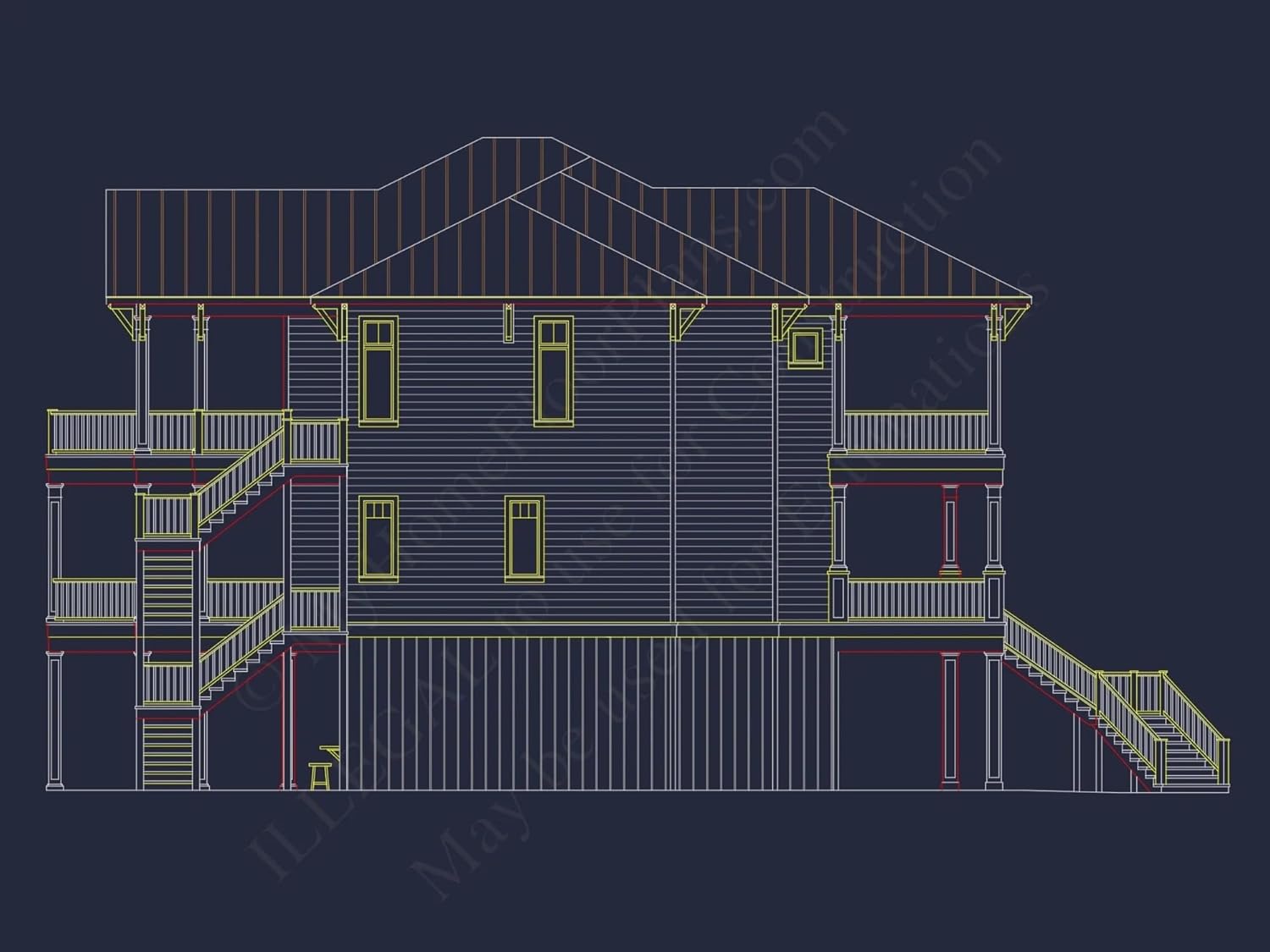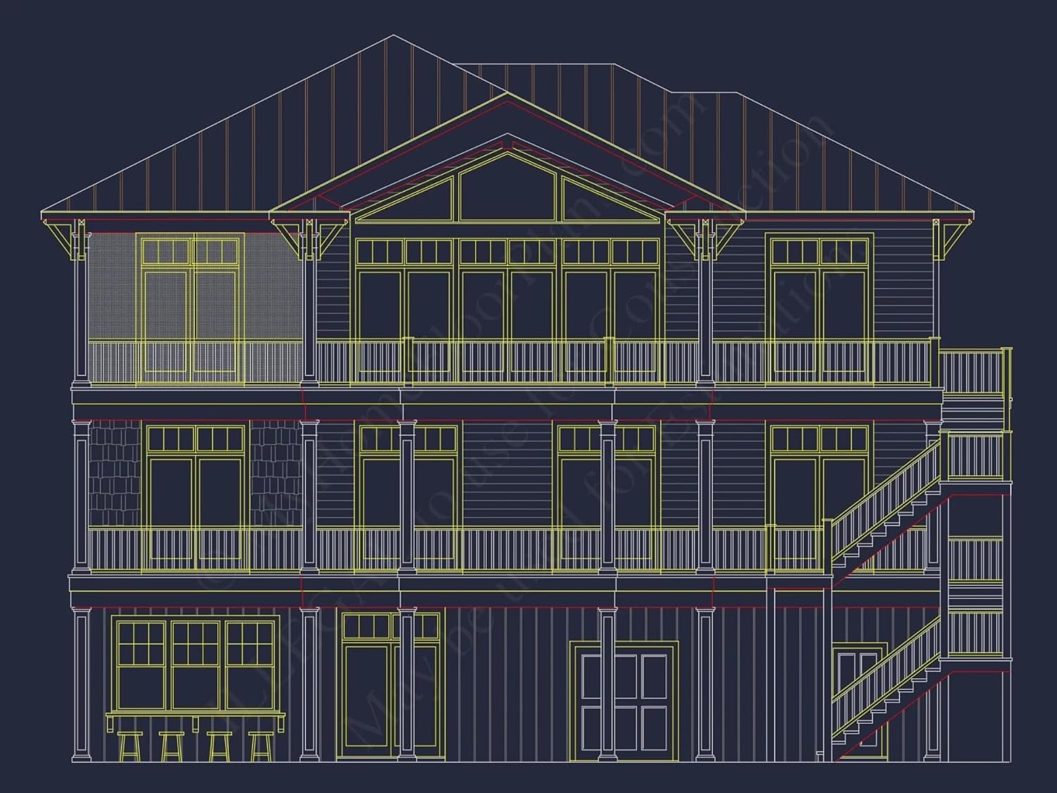 Width: 55′-0″Depth: 60′-0″Htd SF: 4,265Unhtd SF: 2,607Stunning Coastal Home Plan with 5 Bedrooms, 3 Floors, and CAD DesignsDiscover this spacious 5-bedroom, 3-story coastal home plan featuring detailed CAD blueprints, open floor plans, and 4,265 heated square feet for luxury living.This coastal-style house plan offers a perfect mix of open design and elegant function. Crafted for modern living by the beach or in scenic coastal areas, it delivers architectural flair with smart layouts across three stunning levels.Key Features of the Home PlanLiving Areas - Heated & UnheatedHeated area: 4,265 sq. ft. thoughtfully distributed across three levels.Unheated extras: Covered porches, balconies, decks, and terrace for expanded outdoor use.Bedrooms & Bathrooms5 bedrooms including a luxurious second-floor Owner Suite with private balcony and walk-in closet.3.5 bathrooms designed for comfort and efficiency on every level.Interior HighlightsOpen floor plan enhances flow between living, dining, and kitchen spaces. Explore open layouts.Kitchen island and large walk-in pantry streamline cooking and storage.Dedicated office/study offers quiet workspace or reading retreat.Recreation room provides flexible space for games, media, or fitness.Garage & Storage DetailsGarage Bays: Optional side or rear entry garage configurations available.Garage Type: Can be customized as attached or detached.Storage: Includes bonus attic access, linen closets, and mudroom cubbies.Outdoor Living FeaturesCovered front and rear porches ideal for relaxing or entertaining.Upper-level balcony and terrace for elevated views and breezy ambiance.Shaded rear deck for outdoor dining or lounging.Architectural Style: CoastalThis design blends airy layouts with smart vertical planning—ideal for narrow lots and waterfront properties. Learn more about the coastal house plan style or explore global inspiration from