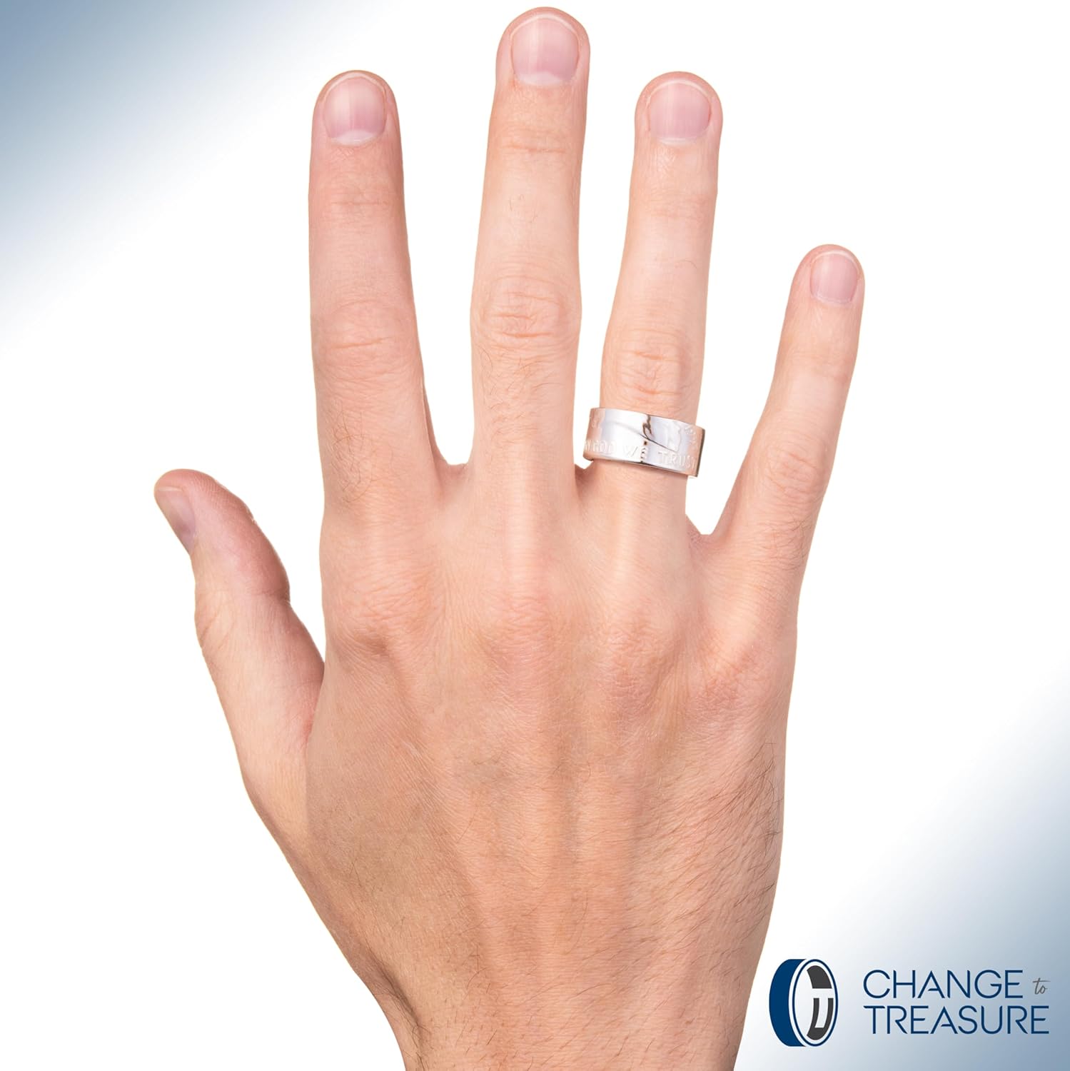 Boasting the largest "In God We Trust" motto of any circulating United States coin, I create these silver coin rings using high-quality Franklin Half Dollars. Time-honored, these rings would make extraordinary gifts for marking special times, including birthdays and anniversaries. The years available are from 1950 to 1963, crafted with the "Heads" (Obverse) design on the outside. The obverse side of the half dollar is the one that includes the year of the coin as well as the words "Liberty" and "In God We Trust." Wear your half dollar ring to commemorate a meaningful year or present it as a unique coin ring gift. I take extra time to ensure that each ring has a smooth, comfortable fit by carefully rounding the inside and out edges. This makes the reeded edge slightly thinner, and completely smooth. As is true with all coin rings, since the reeded edge of the ring is thicker than the smooth side, there will be a slight taper on the inside. I balance this by minimally carving out the inside edge of the ring while carefully preserving the detail. The result is a superior-quality ring with beautiful symmetry and comfort.