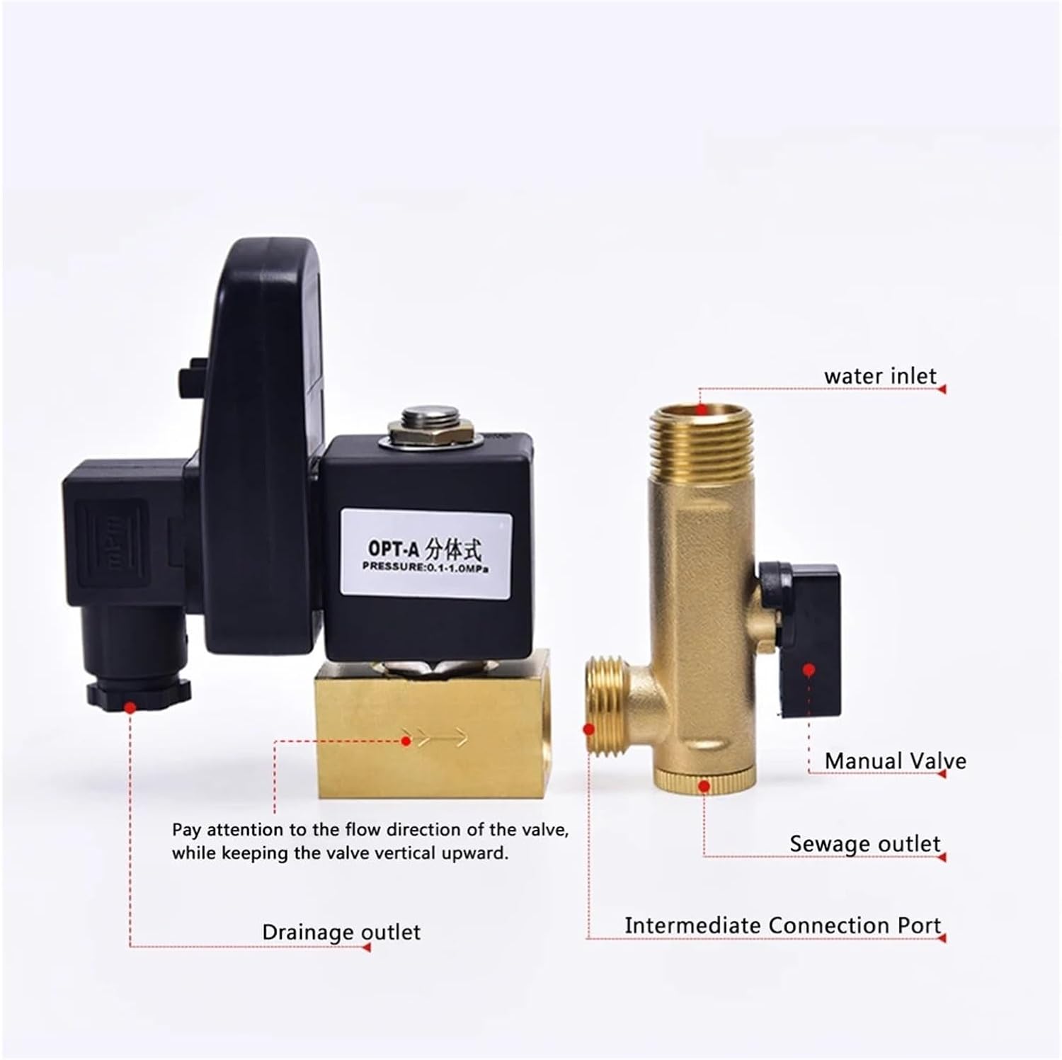 valveSolenoid ValvesClean the compressed air system before installation.Pay attention to the direction of the arrow when installing the valve: do not use hoses that are not resistant to air impact at the outlet.The supply voltage should be the same as the drain valve voltage: when using DC, the positive pole must be connected to connector "1".When leaving the factory, the drain valve has been connected with cables. Brown is the live wire L, blue is the neutral wire N, and yellow-green is the safety ground wire GND.Be sure to tighten the long screws on the junction box to prevent water burn.warn! When installing an electronic drain valve, make sure:The compressed air is exhausted .Power is off.Package Contents:1 x electronic drain valve