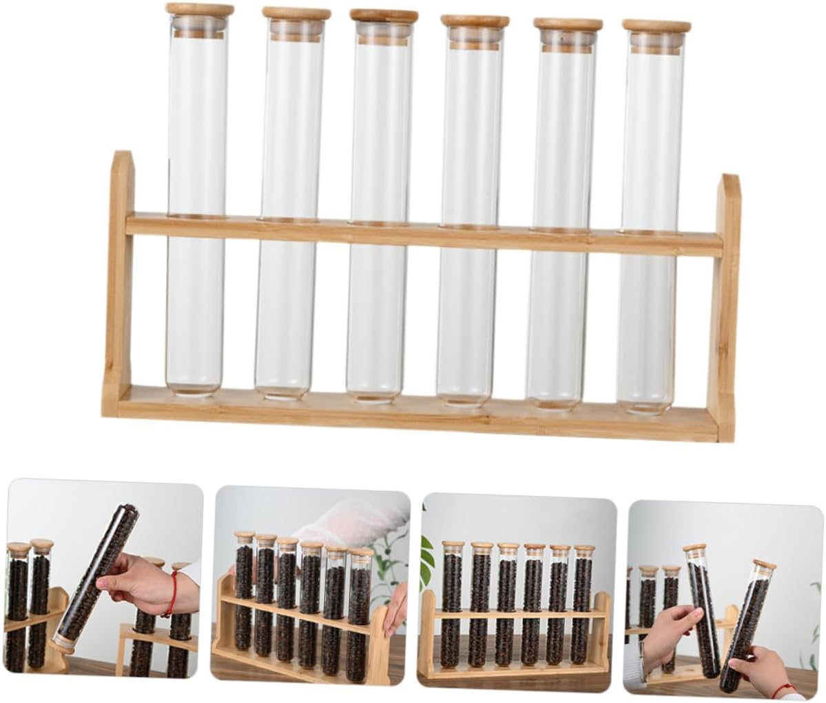 Package Include 6 x glass tubes 1 x wooden stand Characteristics - Versatile use: suitable for home, office, or coffee shop use, and can be used for storing and displaying Glass Tubes. - Multi-functional: This set can contain coffee bean storage sealing jars, and a display rack, very convenient container for coffee. - Space-saving display rack: the rack can hold many test tube-style jars, making the full using of your space tube display stand. -Color:Transparent Coffee Bean Display Jars - Wooden and glass material: made of and clear glass material, with a sleek and modern design Coffee Glass Tubes. -Size:35.50X15.00X7.00cm/13.95X5.89X2.75in(wooden stand) container for coffee beans - Sealing lids for freshness: the airtight lids keep coffee beans fresh for longer periods of time, very useful tube stand. -Size:22.50X4.00X4.00cm/8.84X1.57X1.57in(tube) Coffee Storage Tubes -Material:Wooden, glass coffee bean displayGoods Informationcoffee bean storage like drinking coffee? Are you looking for a container to storage or display your coffee beans? If yes, I think that you can take at your glass coffee bean storage tubes with wooden stand.Glass Tube With Wood Stand The small glass tubes are for storage of your coffee beans, while the wooden stand can help you to store and display these glass tubes with coffee beans