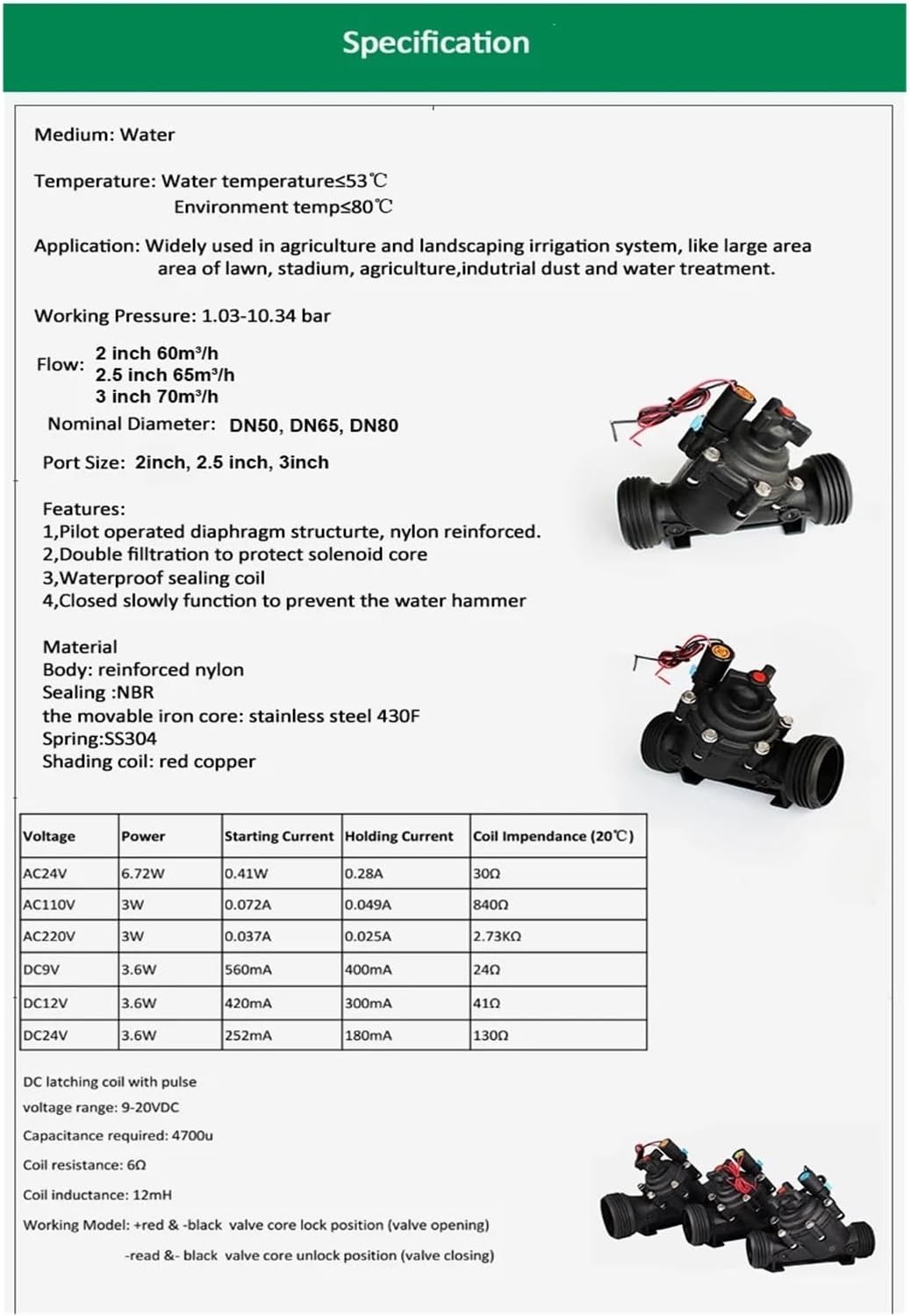 ValvesMedium: Water, Type: Normally ClosedWorking Voltage: 220VAC, 110VAC, 24VDC, 24VAC, 12VDC. Operation: PilotTemperature: Water temperatures 0-53Environment temps 80Application: Widely used in agriculture and landscaping irrigation system, like large area of lawn, stadium, agriculture, industrial dust and water treatment.Working Pressure: 1.03-10.34 barFlow: DN50, 60m3/hNominal Diameter: DN50, Port Size:2"