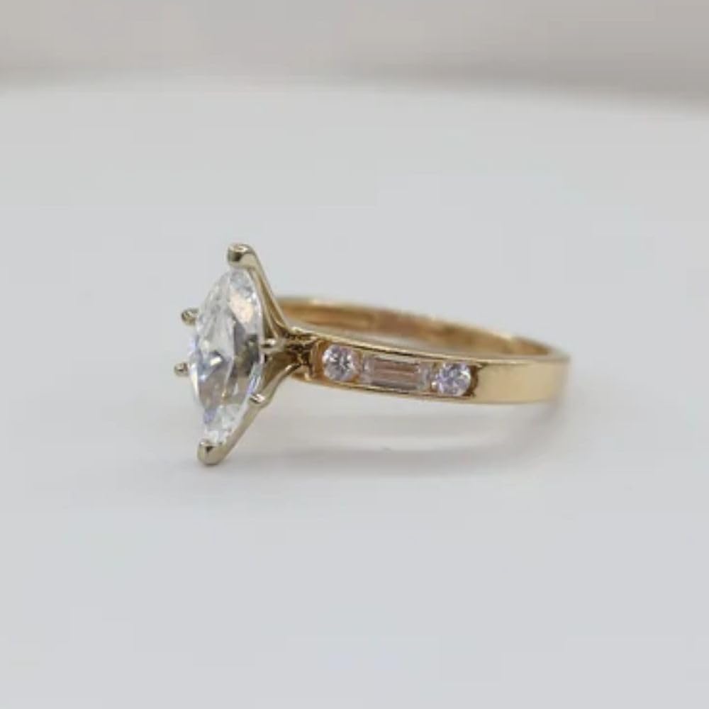 Elevate your style with this exquisite 2 Ct marquise cut diamond solitaire promise ring. Crafted from 925 sterling silver and plated with 14K yellow gold, this elegant ring boasts a stunning marquise cut diamond as the centerpiece, flanked by two smaller round brilliant diamonds. The sleek and minimalist design ensures this ring remains a timeless accessory. Handmade with meticulous attention to detail, this customized jewelry piece is perfect for anniversaries or as an engagement ring. Its classic beauty and quality craftsmanship make it a cherished addition to any jewelry collection.