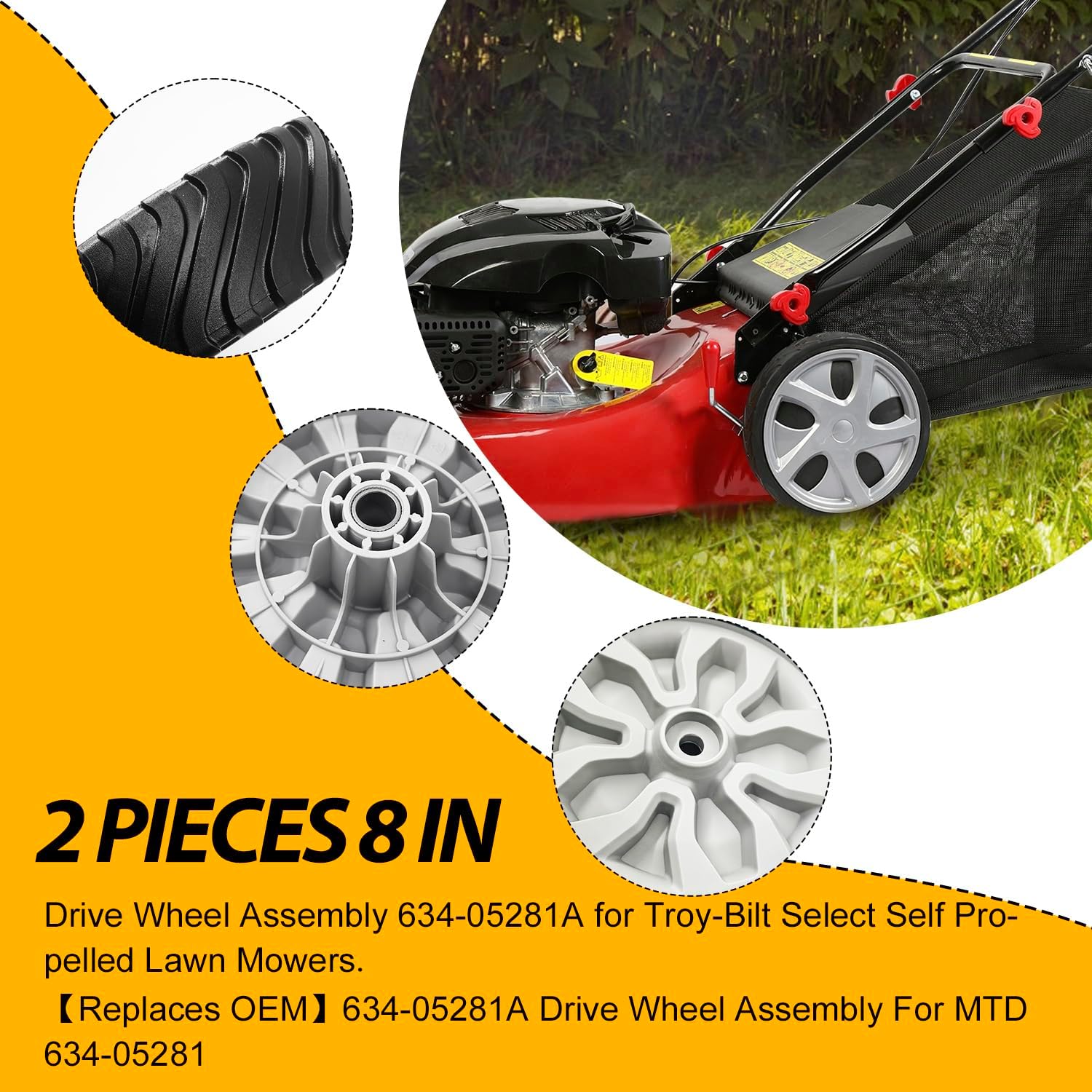 Replace part number : 634-05281A 634-05281 MATERIAL: The wheel is made of high quality plastics and rubber,antifriction, aging resistance, high temperature resistance Fits Models:For Troy-Bil t TB290ES, TB280ES, TB270XP, TB270ES, TB260XP, TB260B XP, TB240K XP 2023, TB240, TB235XP, TB230XP, TB230B XP 2023, TB230B XP 2022, TB230, TB220BXP 2022, TB220 Wheel Size: 8 inch; Bore size: 1/2 inch; Tread Width: 2 inch Package Includes:2 pack lawn mower wheels
