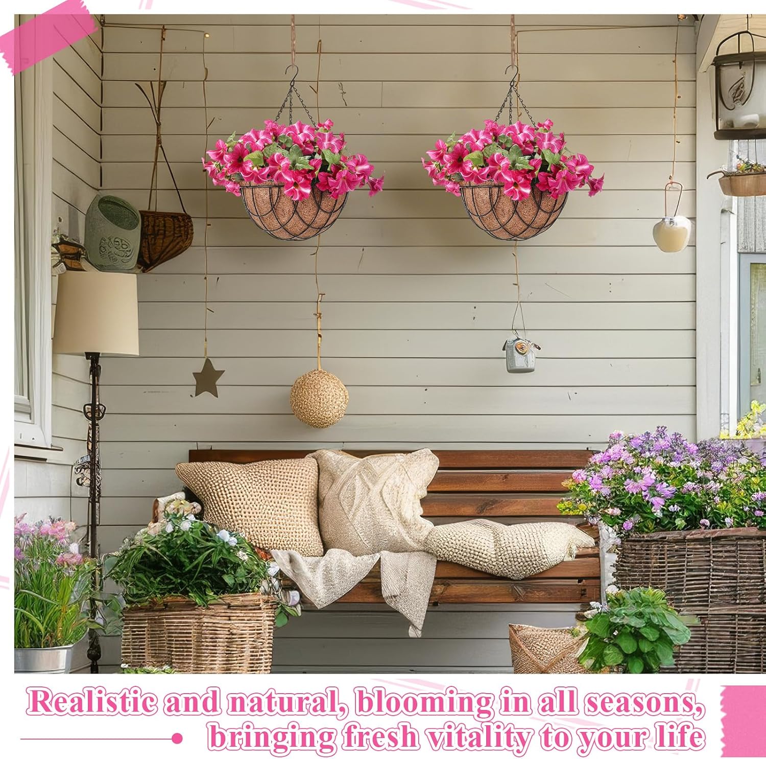 | Material Type | Hanging basket: iron frame, coconut/Artificial grass hemisphere: plastic/Foam hemisphere: foam/Artificial morning glory: plastic, silk/Package Included:/2 x Hanging basket/2 x Artificial grass hemisphere/2 x Foam hemisphere/18 x Artificial morning glory |