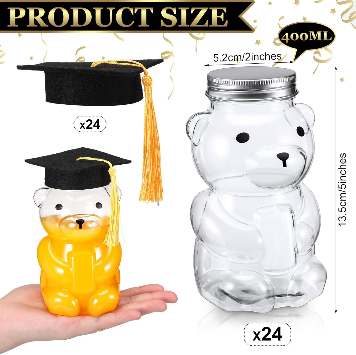 | Included Components | 24 x Graduation bear bottles with silver lids, 24 x Graduation caps |
