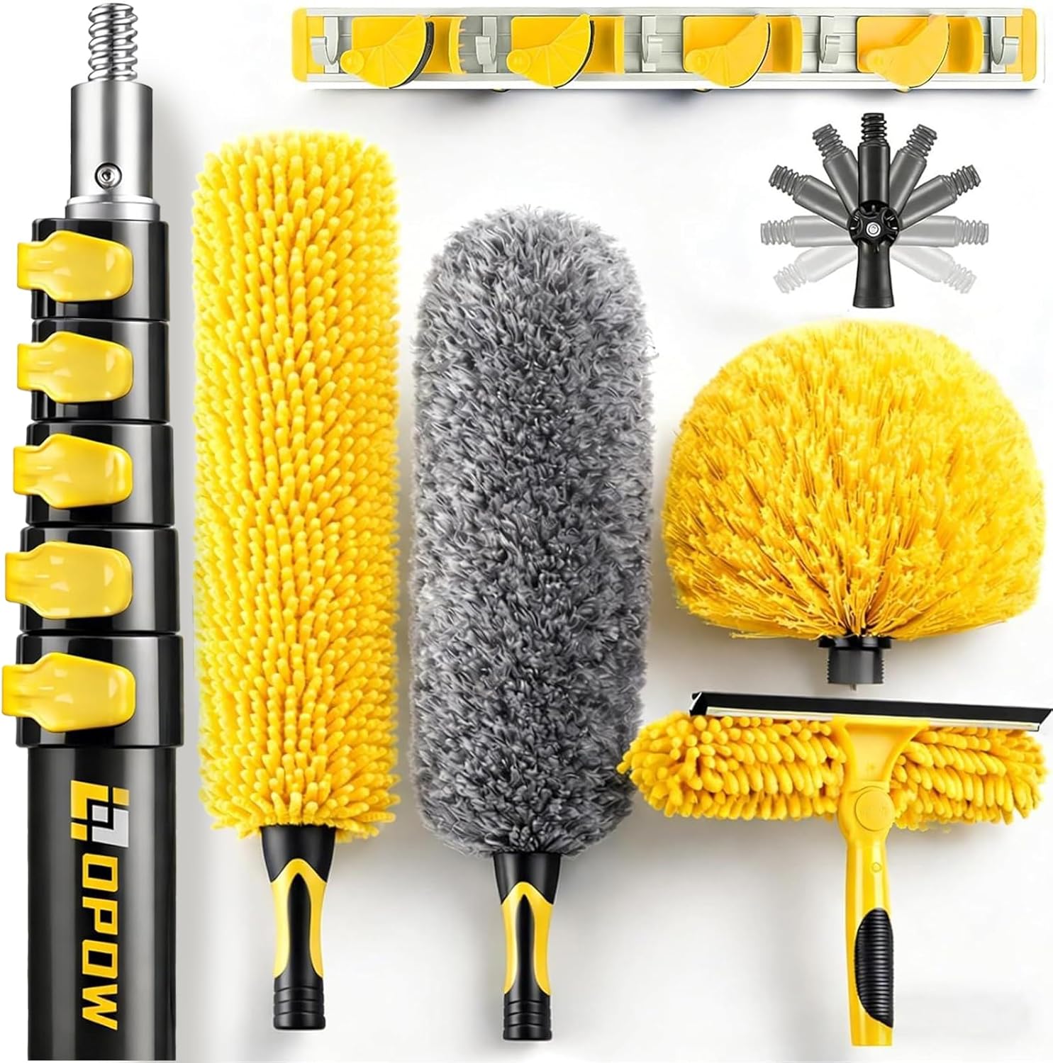 Opow High-Quality and Lightweight Duster for Cleaning kitOur duster for cleaning kit includes microfiber feather duster, high ceiling fan duster, cobweb duster, window squeegee, universal joint and mop broom holder. Opow duster provide a simple and efficient solution to cleaning the hard-to-reach dustCobweb Duster with Extension Pole- Lightweight and premium cobweb duster- Utilizes electrostatic action to attract and hold dust and cobwebs- Dome shape fits into the corner easily- Easily rinse with waterMicrofiber Feather Duster- Clean the dust or dirt easily- Can be bent into different shape as your needs- No scratches and protect your surfaces- Use by hand or with a pole for high-up and hard-to-reach areasChenille Ceiling Fan Duster- Can be bent any angles to get the shape you want- Especially designed for high ceiling fans, chandeliers, or the top of wardrobe- Easily remove the dust and dirt on the top of ceiling fan- Use by hand or with a pole for high-up and hard-to-reach cleaning spotsWindow Washing Squeegee- The perfect solution for your high window- Clean the hard-to-reach window angles by adjusting your swivel- Washable, reusable and environmentally friendlyHigh-Quality Extension Pole- High-Quality and lightweight- Feature with a sturdy metal tip and a screw-on hinge tip
