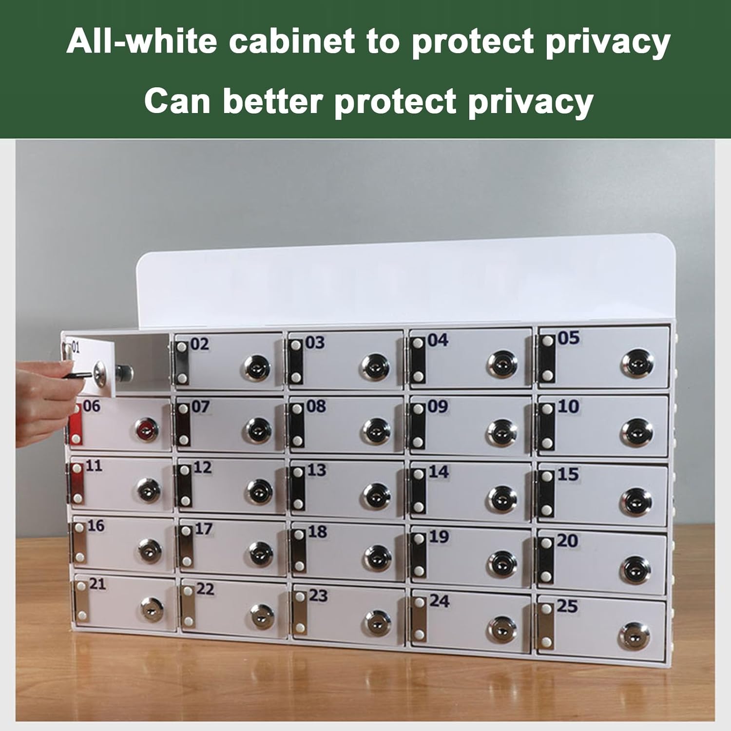 The cell phone locker is made of acrylic, which is reliable and strong and not easy to break or deform. Designed to store small items like cell phones, each slot comes with two separate keys.Keys in different slots cannot open each other, which protects your items. Each slot has a numerical code so that you can quickly find the corresponding slot.Suitable for offices, conference rooms, training rooms, factories, confidential units, gymnasiums, schools, etc. Refuse to be distracted and can devote yourself to study and work efficiently.Product name: Mobile phone storage cabinetProduct material: acrylicProduct specifications: 25 gridsSingle grid size: height 50mm* width 100mm* depth 180mmOverall dimensions: Height 275mm* Width 525mm* Depth 185mmLock type: Key lock (contains 2 keys)Scope of application: Storage and centralized management of mobile phones in classrooms, conference rooms, workshops and other placesThe mobile phone storage box has 25 compartments, each compartment can accommodate 4-5 mobile phones, and a total of approximately 125 mobile phones can be stored.The classroom mobile phone lock box is equipped with a key lock. Each lock has 2 keys. The key can only open the corresponding lock and can keep the items safe.It can be placed on the desktop. It can also be mounted on the wall, saving you space.The mobile phone storage cabinet has built-in numbers for easy searching. Not only can it hold mobile phones, but it can also store keys, wallets, cards