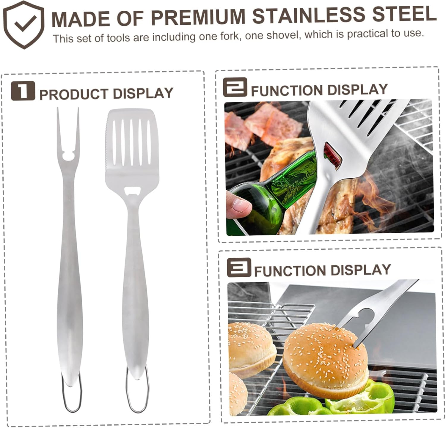 Package Include 1 x barbecue fork 1 x barbecue spatula Characteristics -Color: Silver bbq utensils for grill -Size: About 45.00X9.00X3.00cm/17.68X3.54X1.18inch Barbecue Tools Kit -Material: Stainless steel+plastic barbecue accessories kit -Product Info:Stainless steel baking utensil set -Made of stainless steel and wearable plastic, strong, stylish and barbecue tool kit. -They are very suitable for you and your friends on a picnic or at home to use, which is very practical for you barbecue grill accessories. -Environmental protection and safety feel comfortable and labor-saving more relaxed BBQ Tools Kit. -These products are designed with ergonomic design, making them easy and comfortable to hold grill spatula for outdoor grill. -This set of kitchen tools can meet your different daily life needs because they feature high durability bbq spatula for grill.Goods Informationbarbecue forks They can not only be used as the kitchen tools but also be the great BBQ tools for outside picnic.stainless steel tool accessories This is a set of barbecue tools.grilling tools for outdoor grill They are compact and easy to carry, also can be used at home every day.bbq utensils for grill Made from , they are durable and practical for long time use