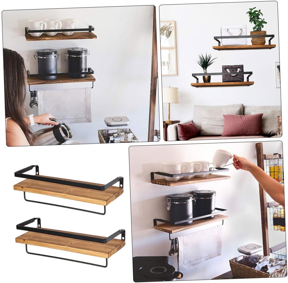 Package List 2 x Storage racks 8 x Hooks 4 x Fixing expansion screws 4 x Big Fixing bolts 8 x Small Fixing bolts Features - Material: Wood, iron. -Product Info:Wall-mounted storage rack - Color: Light brown. - Size: 40.00X15.00X8.00cm/15.72X5.89X3.14inch. - Compared with other floating wall racks, we provide 2 towel racks and 8 detachable hooks, which can hold more towels Wall-mounted Racks. - Our bathroom shelf is made of solid pine wood, which is more heat-resistant, has a longer service life bathroom shelves. - In the kitchen, wall-mounted shelves can be used to place seasoning bottles, and towel racks with hooks can be used for hanging kitchen utensils rustic shelf. - The towel rack can be installed under the floating rack or on the wall. Install as needed kitchen storage rack. - The classic floating wall shelf will add retro style to your bedroom, bathroom, living room, office, etc bathroom shelf with towel hooks.Goods Informationwood shelf for wall Simple design and modern style bracket is great for wall shelf supporting use.towel rack wood These products are made of iron and wooden material, with high strength, good toughness, adjustable and very stable.wall mounted rack wood Can be used for wall shelves fixing, drying racks, clothes storage, and so on