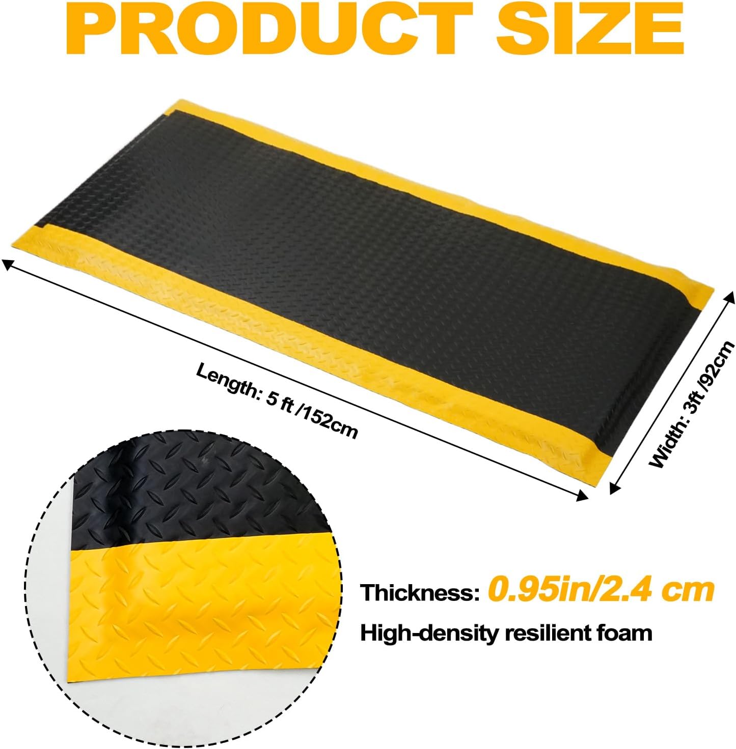Why Choose Our Anti-Fatigue Mat?This professional-grade comfort mat combines orthopedic support with durable construction to enhance workplace comfort and productivity.Key Features:Perfect Size & Comfort: 3' x 5' dimensions with 15/16" thick ergonomic design reduces standing strainHigh-Density Foam Core: Premium cushioning with anti-static rubber surface for durabilityErgonomic Design: Scientifically engineered to reduce fatigue in feet, legs, hips and lower backQuick Maintenance: Easy-to-clean non-slip surface wipes clean and dries fastAll-Environment Use: Suitable for workshops, labs, warehouses, offices and homesWhy It's Essential:Enhanced Comfort: Provides relief during prolonged standing sessionsSuperior Support: High-density core maintains cushioning under heavy useHealth Benefits: Reduces pressure on joints and improves circulationLow Maintenance: Saves time with easy cleaning requirementsVersatile Application: Works in both industrial and residential settingsIdeal for professionals requiring extended standing periods, this anti-fatigue mat delivers comfort combined with durability for all-day support.