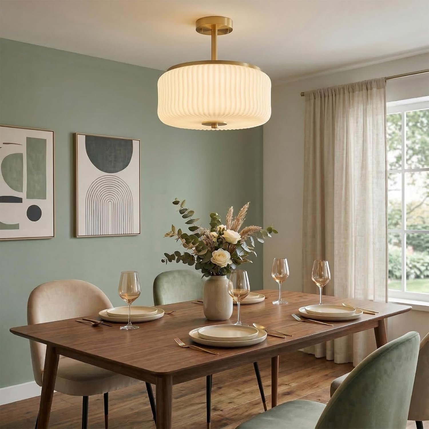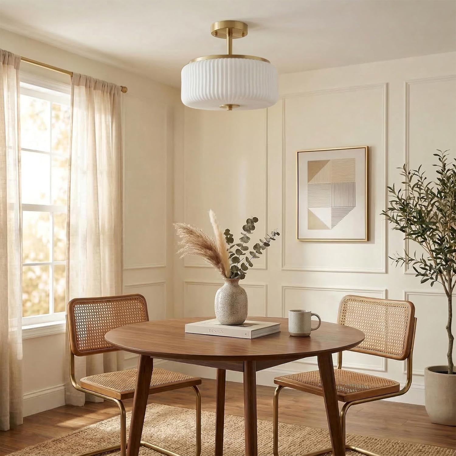 • ๐ŸŒŸ [ELEGANT RIBBED OPAL GLASS & NO GLARE] Unlike cheap plastic or fabric shades that dim the light, our semi flush mount ceiling light features a hand-blown ribbed opal glass shade. This unique texture disperses light evenly, eliminating harsh glare while adding a sophisticated Mid-century Modern touch to your ceiling. The high-transmittance glass ensures your space feels bright yet soft and welcoming.
