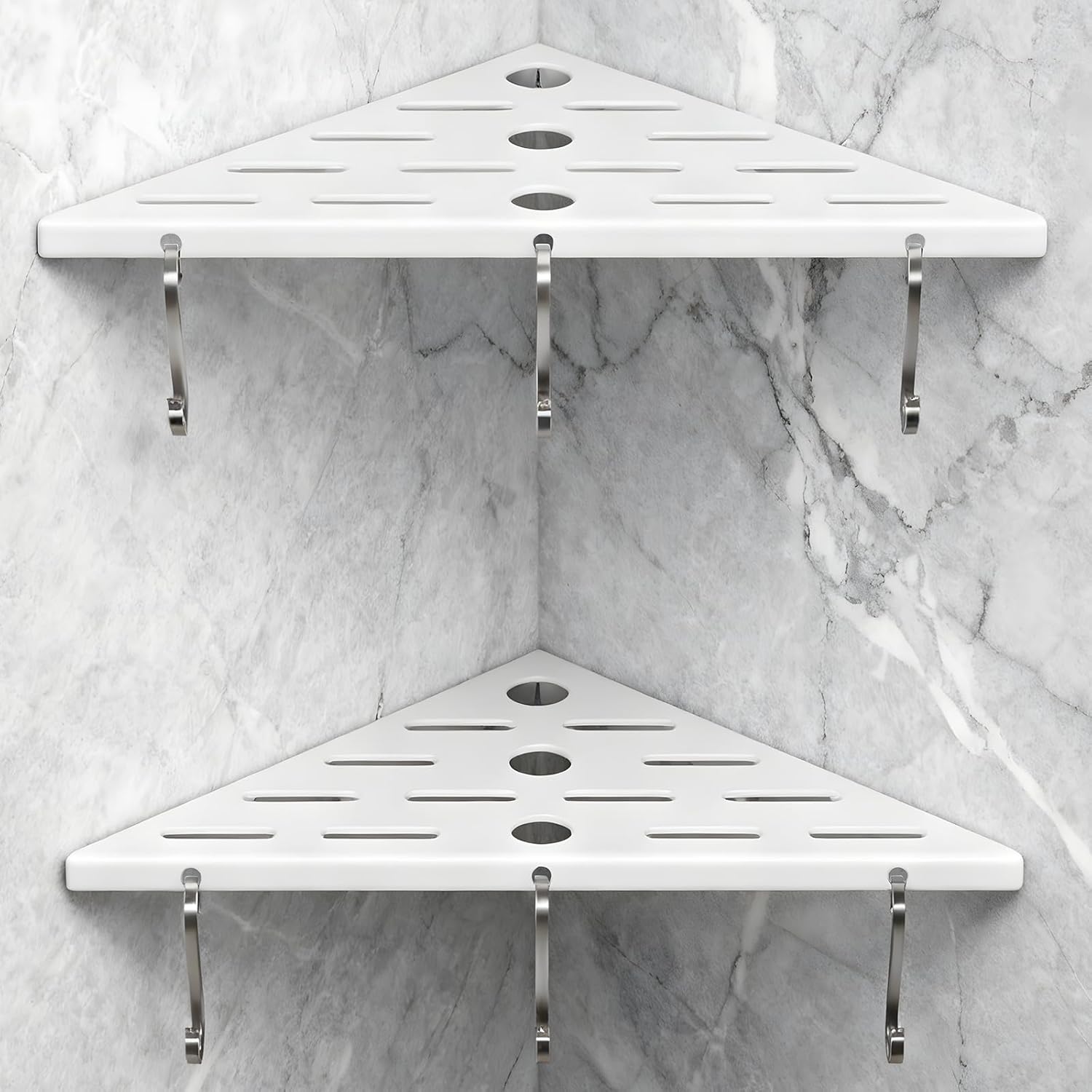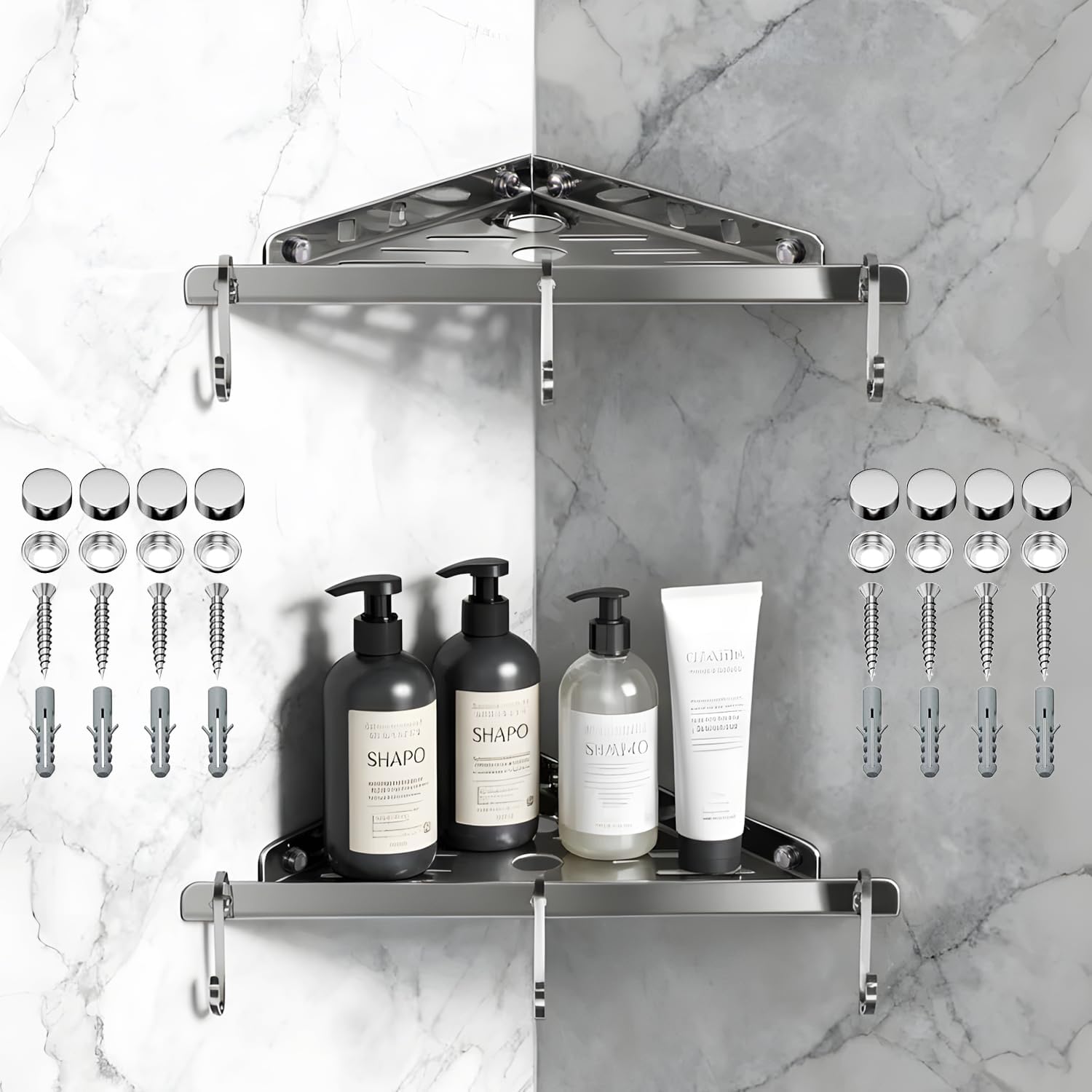 | Set Name | 3-tier shower shelf set with 6 hooks, 40 lbs total capacity, stainless steel, silver |