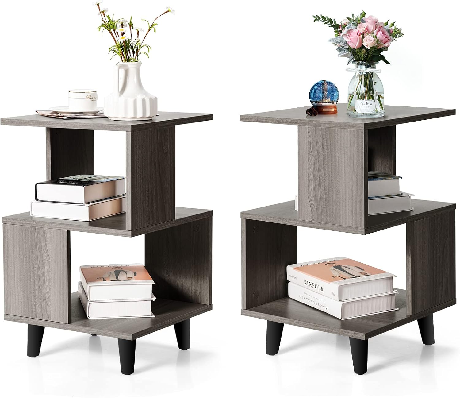 Description:This contemporary furniture set features a wide tabletop with double shelves for open display and storage, making it easy to store and display books, mugs, photos, plants and more. The bedside table consists of 2 small desks that can be combined into a bookcase or display shelf, or used alone as a night stand or end stand, making it a versatile choice for small spaces. The end table features thick wood panels and sturdy support legs for excellent stability and durability, and a 6.5-inch overhead design for easy cleaning. Its unique geometric aesthetic adds colour and texture to a living room, bedroom, den or home office as a standout piece.Feature:Unique geometric shape to match a variety of home stylesDesktop and double shelves providing plenty of storage spaceOpen shelves for more portable access2 small desks can be combined or used aloneThickened wood boards with sturdy legs for stability and durability6.5-inch overhead design for easy sweeping under the tableGeometric aesthetics highlights the texture for the spacesScrew holes in the cover design of the appearance of stylish simplicitySmooth surface treatment for easier maintenanceSpecifications:Color: Dark Grey/Light GreyMaterial: Engineered Wood, PlasticProduct Dimensions: 16" x 16" x 27.5" (L x W x H)Shelf Dimensions: 16" x 14.5" x 9.5" (L x W x H)Leg Height: 6.5"Weight Capacity: 100 lbsNet Weight: 34 lbsPackage Includes:2 x End Tables1 x Instruction