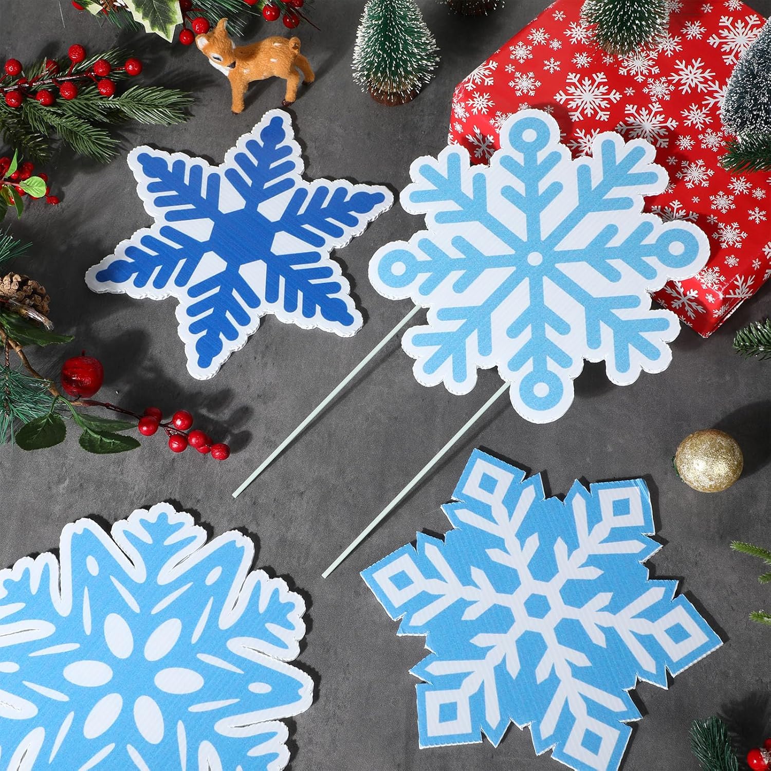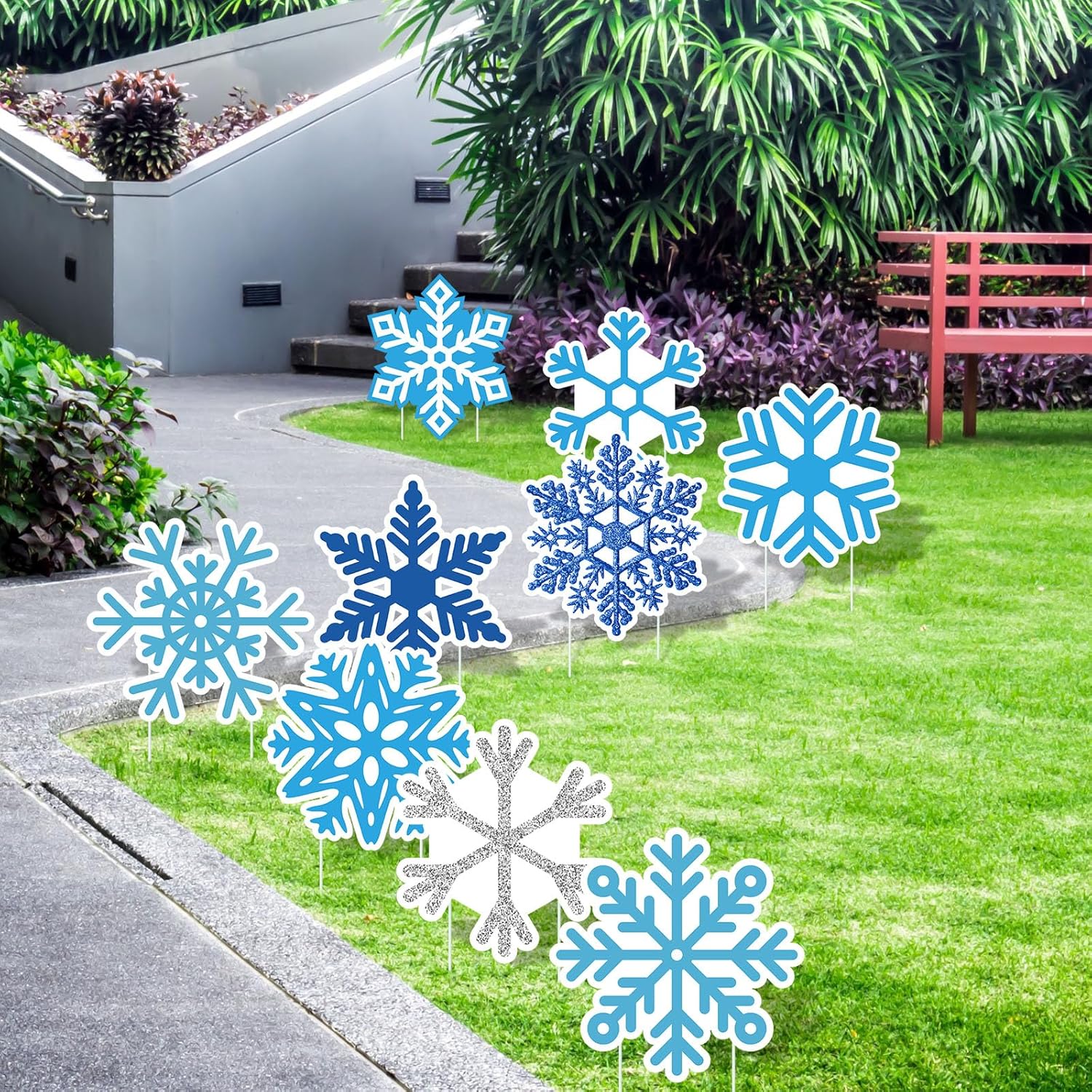 Features: Highlight your celebrations: These vibrant sequins snowflake yard decorations with stakes are the ideal way to add a festive touch to your lawn, patio, etc, decorate your home and party in winter style. Multipurpose appeal for year round use: While it's ideal for winter Christmas parties, this versatile lawn sign can be applied for other occasions where you want to bring a bit of tropical charm, from birthdays to anniversaries to welcoming gestures. Specifications: Main material: plastic corrugated board Main color: blue, silver Size: approx: 9.84 x 9.84 inches/ 25 x 25 cm(LxW) Package includes: 30 x Winter snowflakes yard signs 60 x Plastic stakes Notes: Manual measurement, please allow slight errors on size. The color may exist a slight difference due to different screen displays.