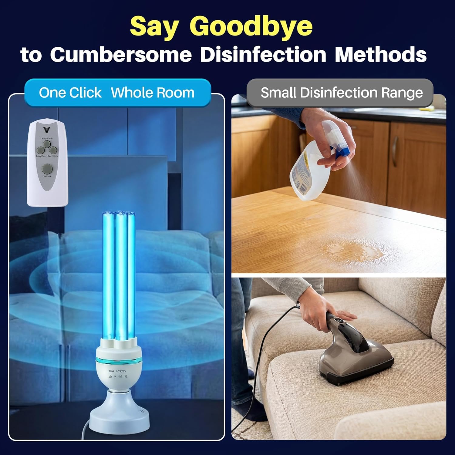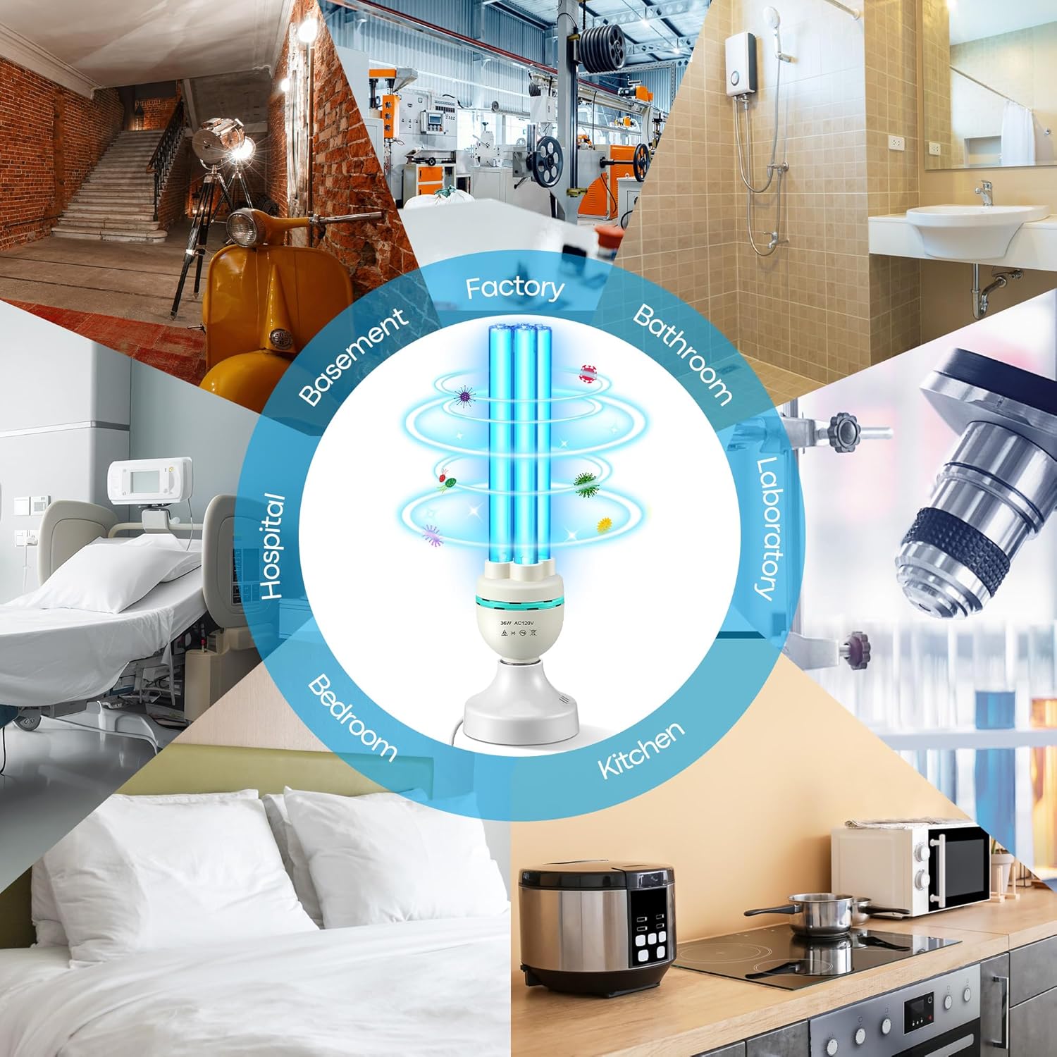 Specifications: Power: 36W Voltage: 110V Light Socket: E26 Coverage Range: up to 500 Sq ft Package includes: 1 x Ozone Free UVC Lamps 1 x Remote Control 1 x UV Protection Glasses Notes: 1. When installing and using the lamp, please do not use excessive force. Both hands should hold both ends of the lamp and screw it in. When replacing the lamp, the power supply must be cut off. 2. Ultraviolet rays can cause burns to the skin and eyes, so please pay attention to protection. Avoid direct exposure to the human body for a long time. 3. Do not expose pets and plants to prolonged exposure. 4. Pay attention to covering valuable indoor paintings and calligraphy to prevent oxidation and discoloration due to long term ultraviolet rays. 5. When cleaning the UV lamp, please cut off the power supply and wipe it gently with a clean soft cloth or alcohol. Do not wipe it with organic solutions such as petrol. 6. Prevent children from playing and touching. 7. After disinfecting the room, please open the windows for ventilation