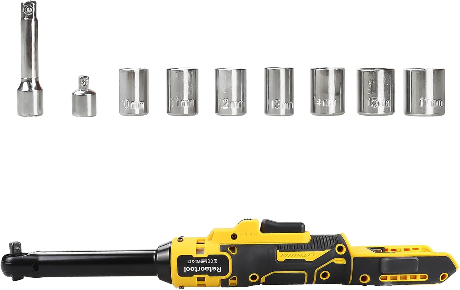 | Included Components | 1 x Electric Ratchet Wrench, 7 x sockets (10, 11, 12, 13, 14, 15, 17mm), 1 x 1/4 inch drive adapter, 1 x 3 inch extension bar |