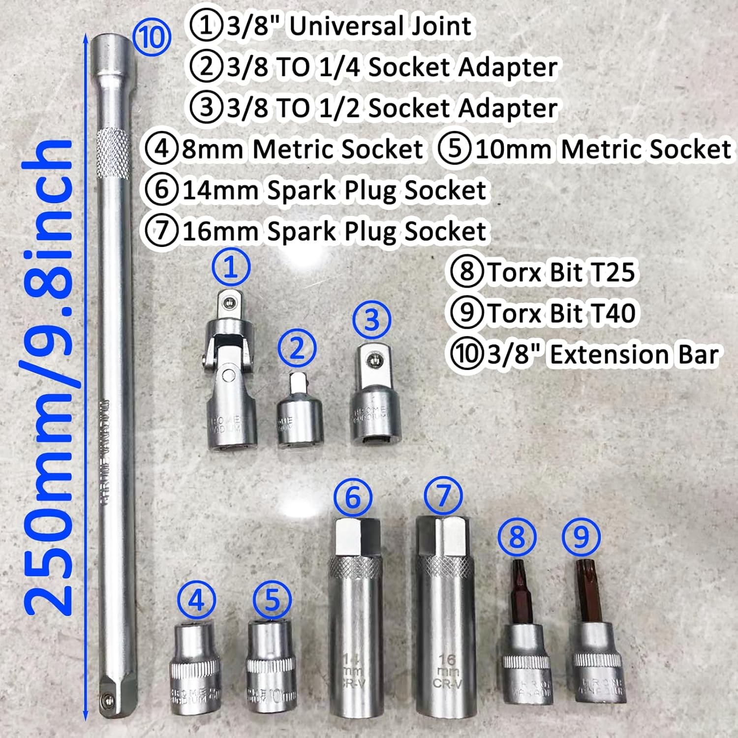 | Included Components | 2 Torx Bits (T25, T40), 3/8 Inch Drive (F) x 1/4 Inch (M) Socket Adapter, 3/8 Inch Drive (F) x 1/2 Inch (M) Socket Adapter, 3/8" Click Torque Wrench, 3/8" Extension Bar (250mm/9.8inch), 2 Shallow Metric Sockets (8mm, 10mm), Calibration Certificate and User Manual, 3/8-inch Universal Joint, Sturdy Storage Case, 2 Magnetic Spark Plug Sockets (14mm, 16mm) |
