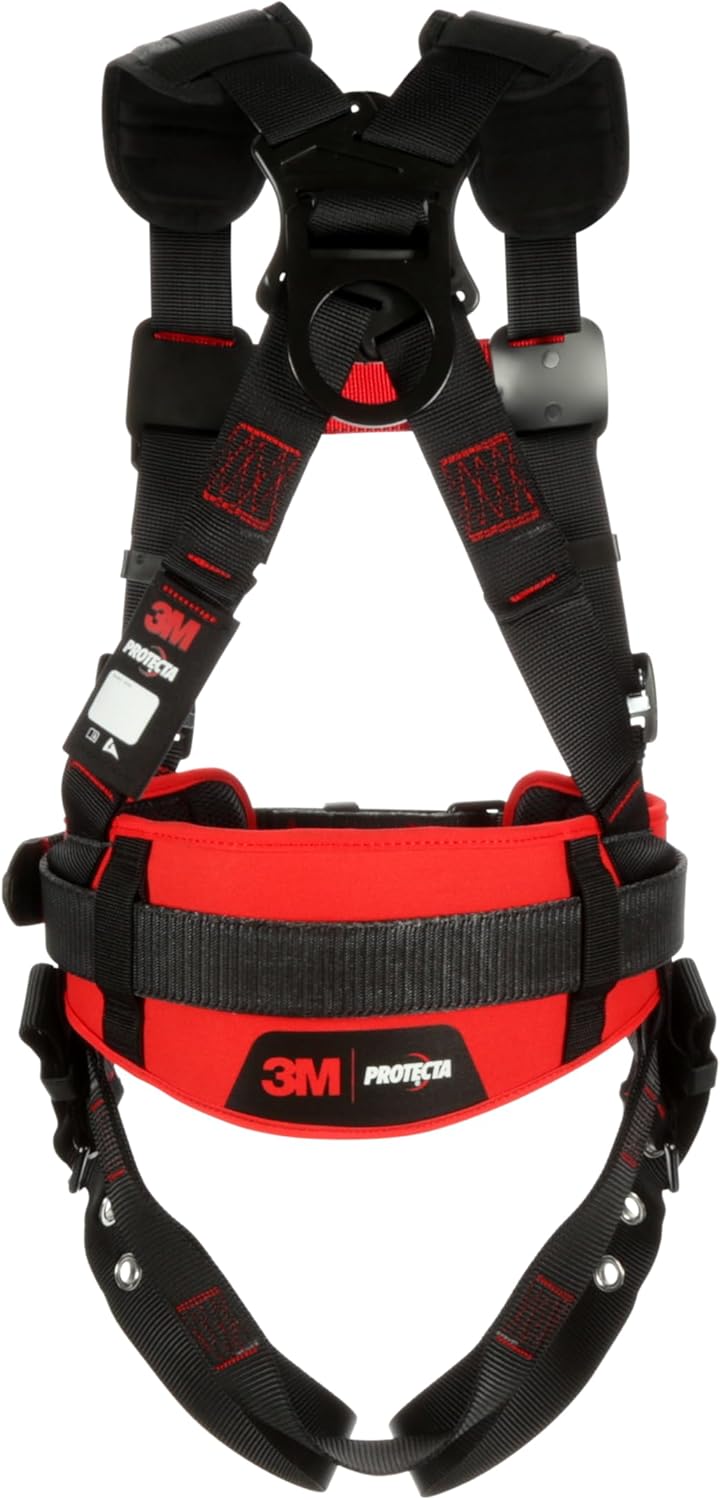 3M™ Protecta® construction-style harness with a fixed back D-ring to minimize workday readjustment, and breathable shoulder/hip padding. Plus, a durable and sturdy belt, tongue-buckle leg connection, and pass-through chest connection. Specially designed for added comfort and convenience, These harnesses are Rated for 420 lbs (190 kg) total working weight.