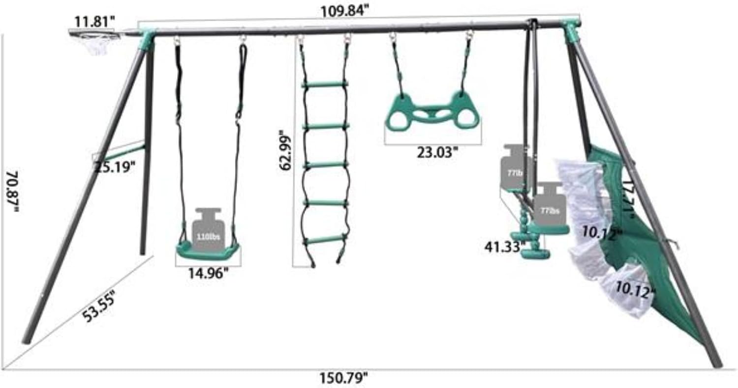 A delightful playground addition designed to bring endless fun to children three years and up. Decorated in an attractive dark green and black combination, this swing is more than just an ordinary swing - it's a world of imagination and adventure nestled in your backyard. Measuring 70.97 inches high, 53.55 inches wide, and 150.79 inches long, this swing offers plenty of room for kids to swing, climb, and play to their heart's content. Its removable design ensures easy assembly and disassembly for storage or relocation as needed. Color: Black Green Assembled Length (inches): 150.79 Assembled Width (inches): 53.55 Assembled Height (inches): 70.97 Weight Capacity (lbs): 550