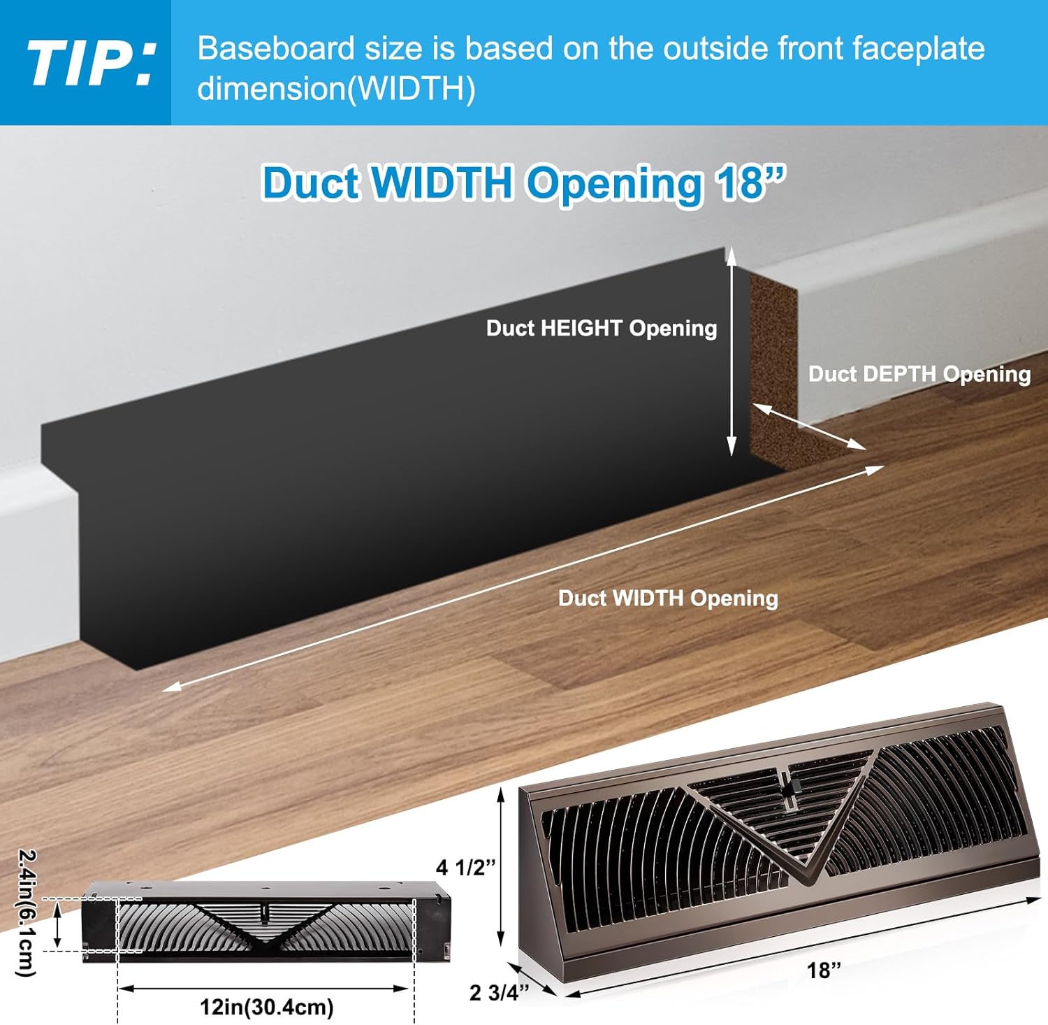 Features: The oil rubbed bronze color of this baseboard vent complements many interior design styles, vintage or modern. Besides, the sunburst design enhances the overall aesthetic appeal, bringing an elegant charm to your space. An artistic yet functional piece, this baseboard register is ideal for those who appreciate practical design and functionality fused into one. Quality material, easy installation, and effective airflow control make the baseboard register 18 inch a practical tool. Choose these baseboard registers for a nice blend of design and function. Specifications: Material: cold rolled steel plate Color: oil rubbed bronze Size: about 18 inches duct opening size Package includes: 4 x Baseboard registers Notes: Manual measurement, please allow slight errors on size. The color may exist a slight difference due to different screen displays.