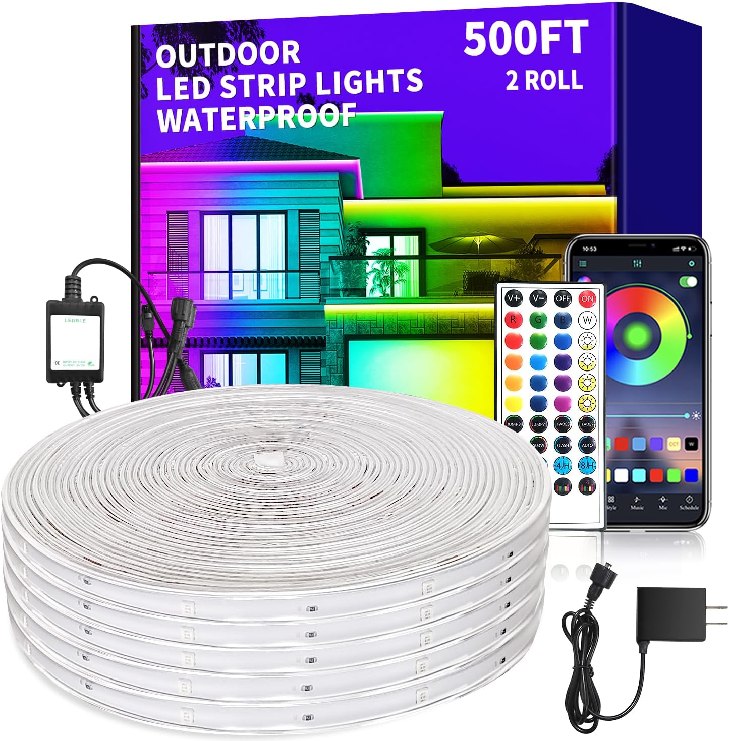 400Ft Outdoor Waterproof LED Strip Lights,Music Sync RGB IP68 Led Lights with App and Remote Control ,Color Changing Waterproof RGB Exterior Rope Self Adhesive back,Balcony,Roof,Garden,Party