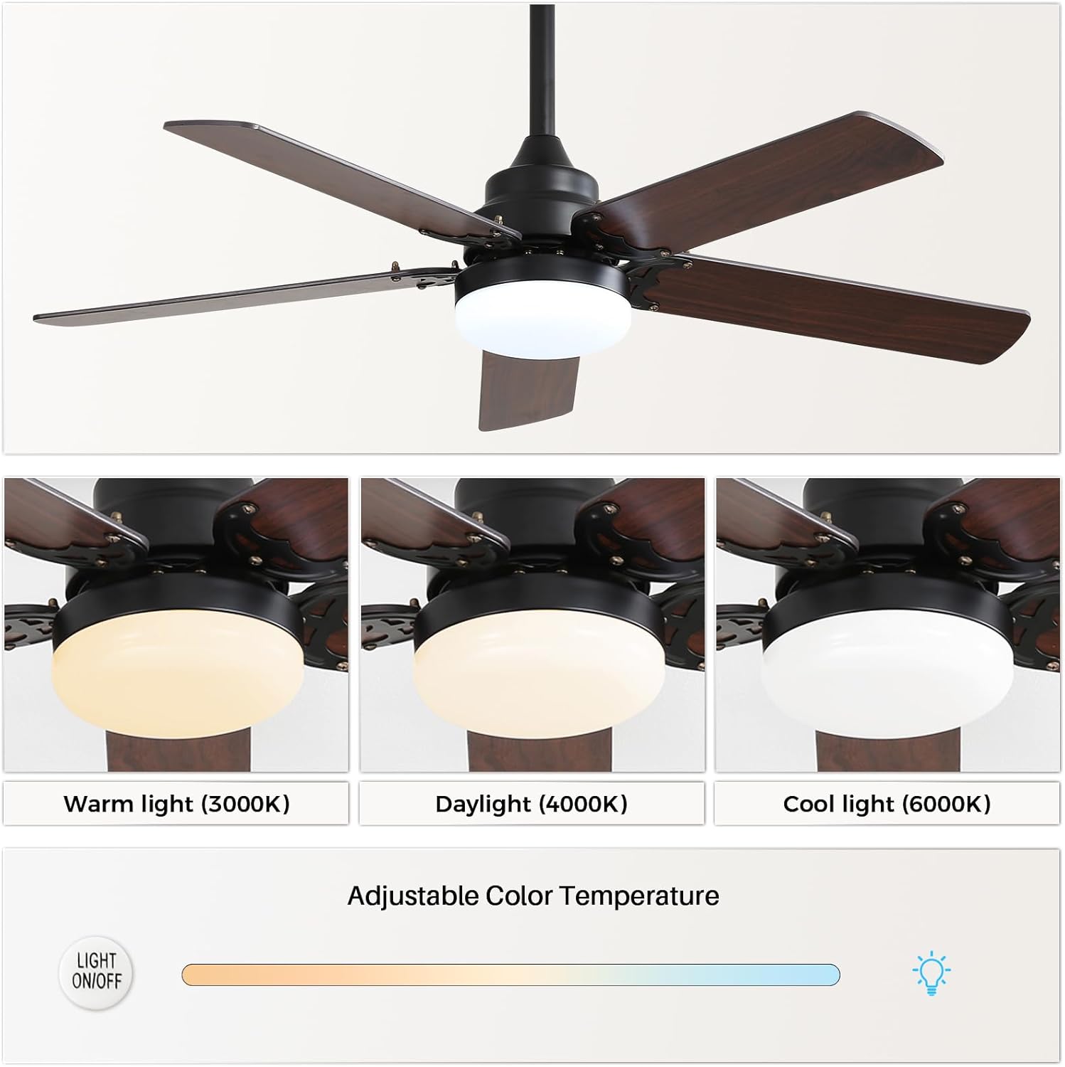 Modern 42 Inch Ceiling Fan 42 inch modern high-quality ceiling fan is simply and beautifully designed to complement any room decor, perfect for those who want to add a touch of sophistication and elegance to their home or outdoor space, suitable for patio, gazebo, living room, bedroom various places. Also features MDF blades that are both durable and long-lasting. Reversible Dc Motor The modern ceiling fan can be forward and reversible, perfectly circulates the air, keeping it nice and comfortable, so it can be available for four seasons. Dimmable LED Light The modern ceiling fan with lights of 18W, which is energy-saving and of long service life. The color temperature can be adjusted from warm white (3000K) to natural light (4000K) and to cool white (6000K), creating an ideal atmosphere as you wish. Three Mount Options Dynamic hanging abilities. This farmhouse ceiling fan provide multi mount way which include a down rod, 5” and 10'' downrod (standard ceiling), angled-mount (sloped ceiling) and flush mount (flat ceiling).