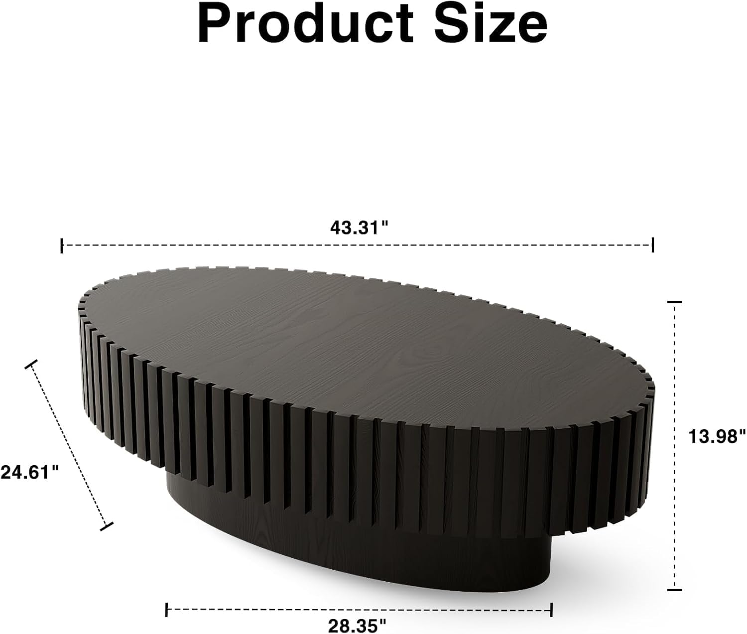 43.31" Black Oval Wooden Coffee Table, Luxury Fluted Drum Center Table with Handcrafted Relief Pedestal, Mid Century Modern Coffee Table for Living Room Home Office Apartment