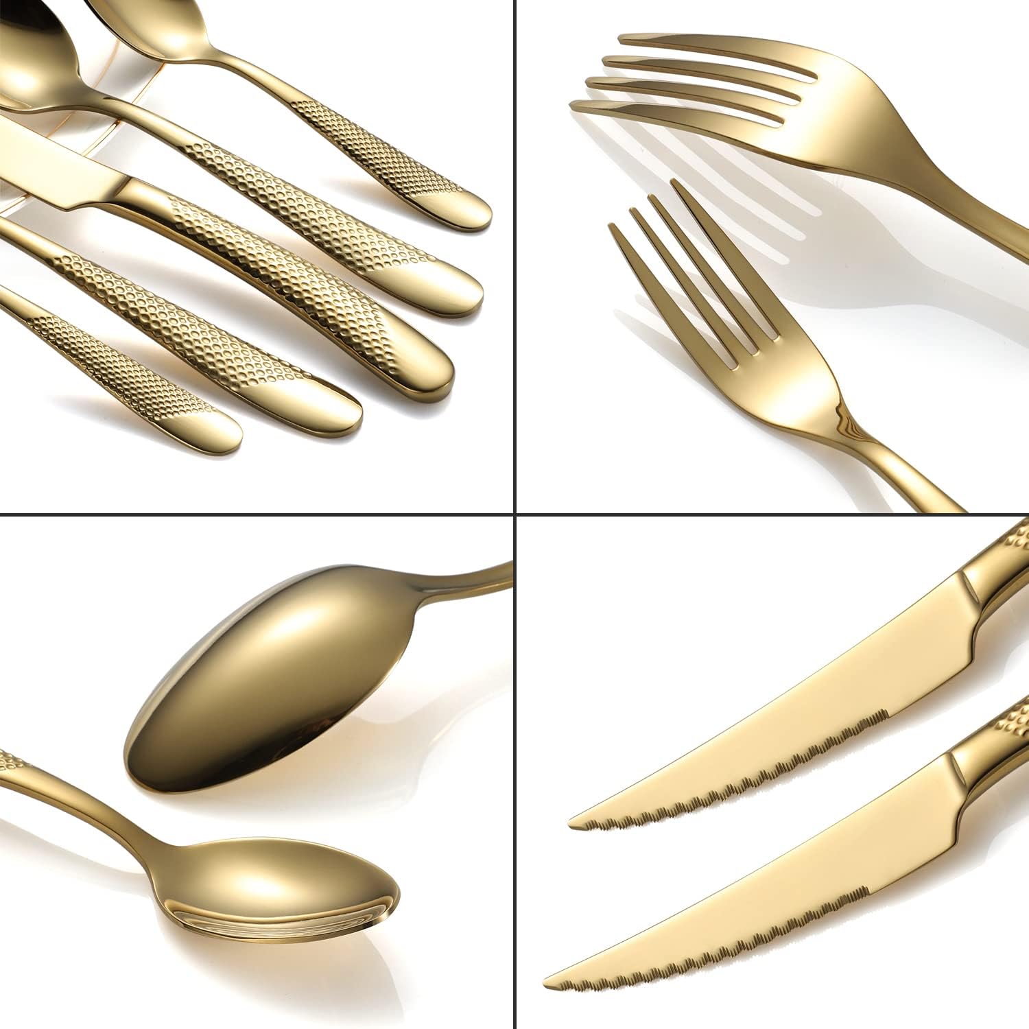 40-piece silverware set,serving for 8. Salad forks x8 Dinner forks x8 Dinner knives x8 Dinner spoons x8 Teaspoons x8 5-piece serving utensil set: Serving fork, serving spoon, slotted serving spoon, pie server and butter knife. Made of high quality stainless steel, the material is sturdy and easy to clean. This silverware set is medium weight and comfortable to hold. Gold tableware set with hammered handle design, simplicity and elegance. Suitable for many occasions, such as family and friends gatherings, parties, holiday dinners, etc. Also suitable for camping/restaurant/hotel available.
